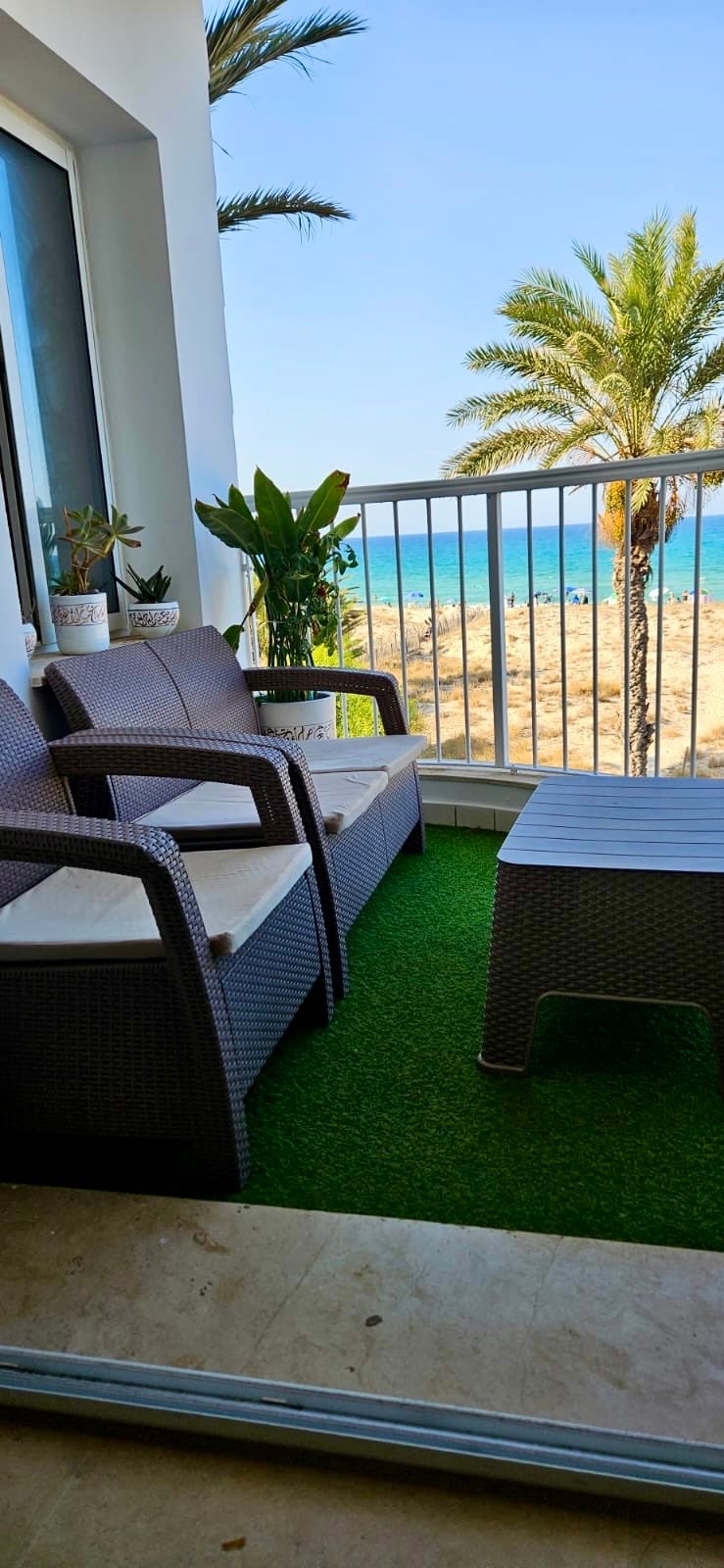 Facing the sea. With terrace and stunning views. 2 bedrooms, living room, bathroom and kitchen. Salakta is a popular city in Tunisia, a simple and beautiful city for uncomplicated people. ideal for families of up to 6 adults and children. Activities: swimming pool, museums, hiking, fishing, excursions, beach, games.