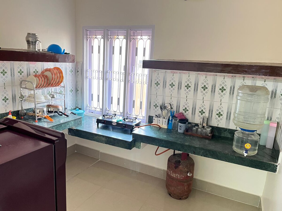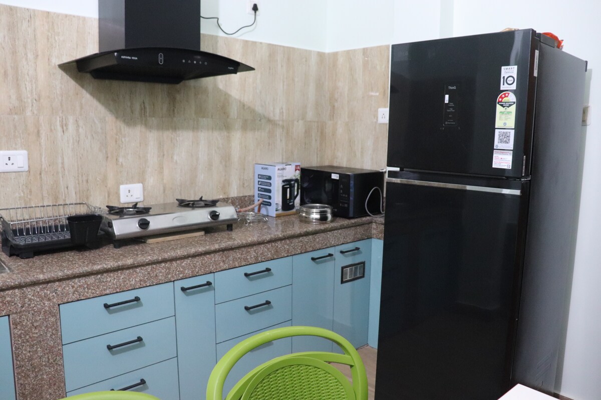 Welcome to our cozy and thoughtfully designed 3-room apartment, perfect for families, groups, or remote workers! Each bedroom features a comfortable queen bed, ceiling fan, wardrobe with locker, and its own unique vibe Room 1: Entertainment room with TV Room 2: The only room with AC workspace & story books Room 3: Recreational space to relax or stretch Enjoy a functional kitchen, high-speed WiFi, a common area with both Indian & western toilets, separate bathroom with geyser, and free parking!