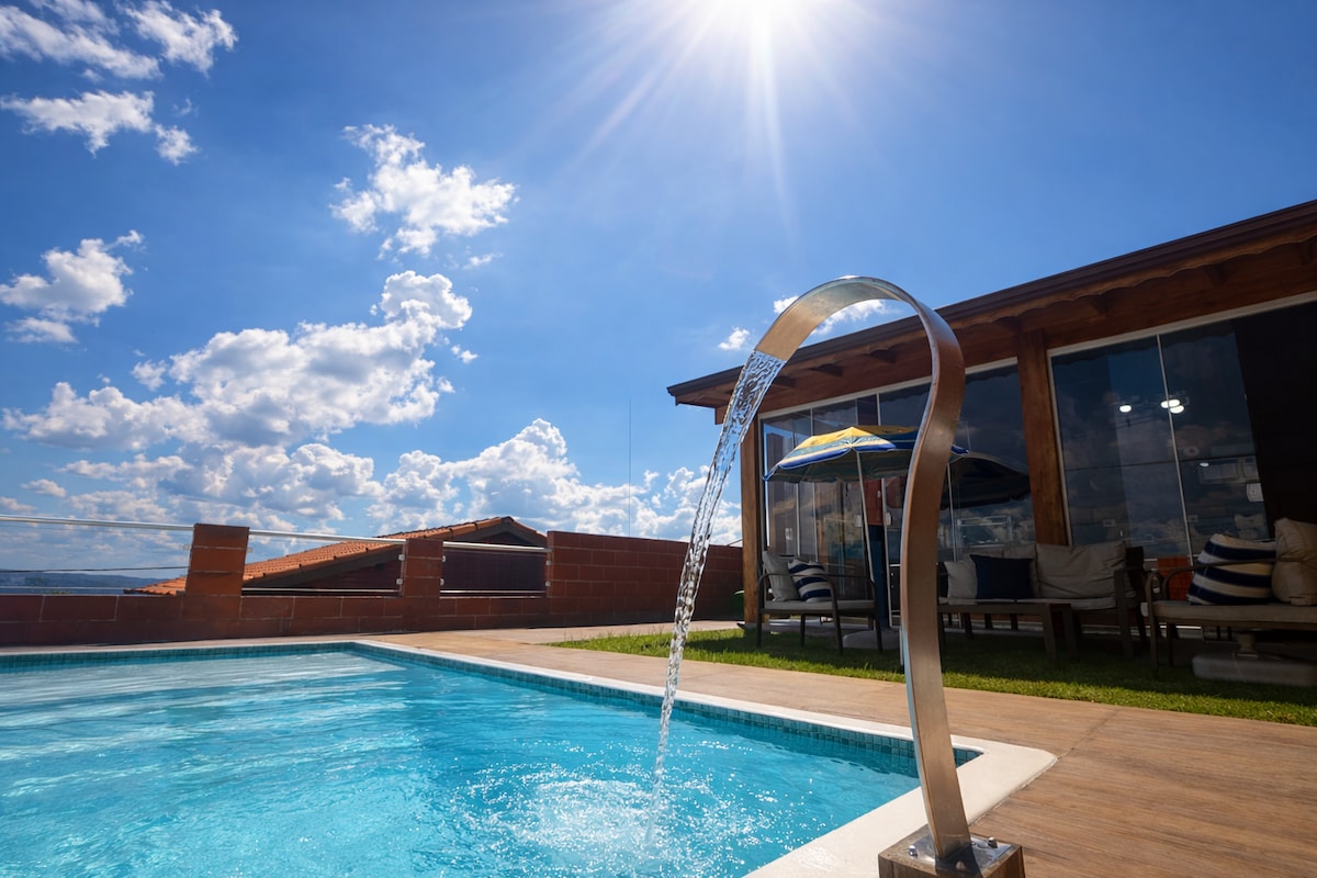 Relax with the whole family, your leisure awaits you here!Come live a dream, 50 min from SÃO PAULO, get away from the daily grind, rustic house that brings you peace and quiet/gated community, house with pool, barbecue, wood stove, oven! Heated HYDRO, sunset view, accommodates up to 7 people, WI-FI, 75-inch TV, Netflix, Prime, Paramount, Premiere, market, wine cellar, pizzeria, bakery 10 min away (Water park $60 entrance) Lounge area with large and children's pool, barbecue and ping pong