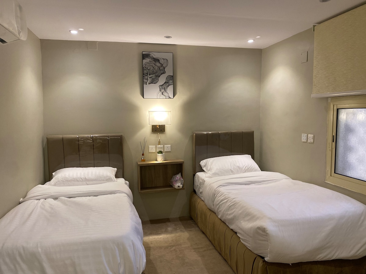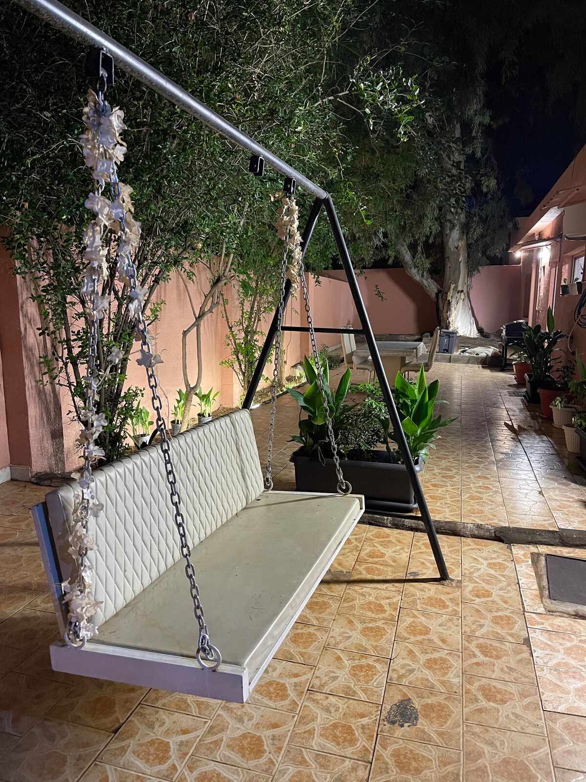 Enjoy with the whole family in this two-room house (a master bedroom with a double bed) and (a studio room on the upper floor with a large space with a double bed and a sofa that can be converted into a bed and a sitting area overlooking the farm and a dining table) and (a fully equipped kitchen) and (a private yard with an outdoor sitting area and barbecue equipment) and outside there is a garden with children's games and the site has cameras for your safety. Available: Complimentary healthy water. Distilled coffee v60 hospitality. 5G on-site internet service. IPTV Falcon-STC TV viewing options Bathroom amenities. Interactive games.