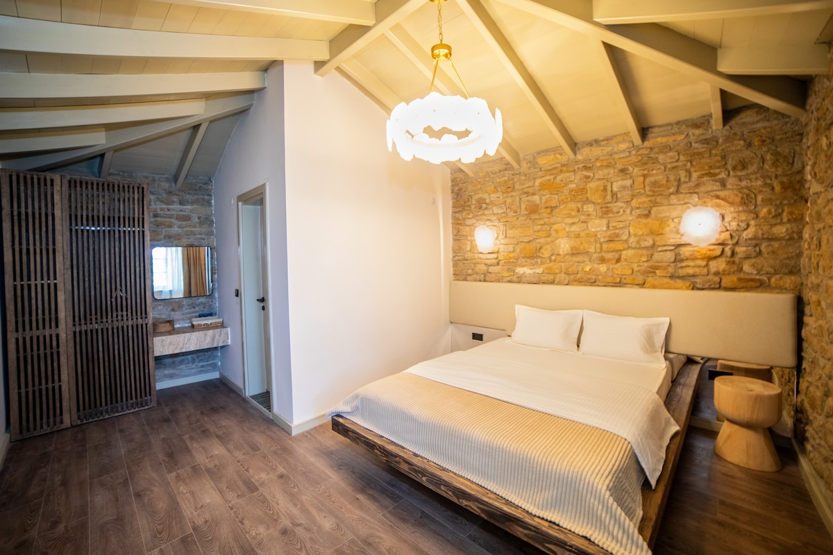 Its a renovated traditional farm house of 1900 years,on 150m.above sea,in spacious land with olive,oaks,fruit trees in 2 levels open.sp,2 k.s. beds,1double bed,1bed under the srars& hammocks, bathroom,kitchen, photovoltaic autonom system for full lighting, charging devices, fridge, kitchen,fire place.Traditional old wood oven exists! Great peaceful, harmonic environment, yoga,meditation,var.activities hiking,swiming in the river,water falls, in the sea, great food (fish,baked goat,trad.products)