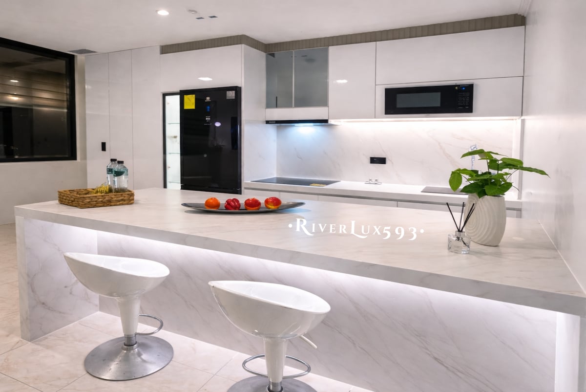 Welcome to our luxurious suite, located minutes from the airport, in Puerto Santa Ana Port, the safest area of Guayaquil, where you can walk freely. Here you can enjoy an exceptional view of the river and the modern boulevard, creating a relaxing and exclusive atmosphere from the moment you enter. Its main feature is its incredible luxury design and double river view in the room Both the living room and bedroom have Smart TVs.