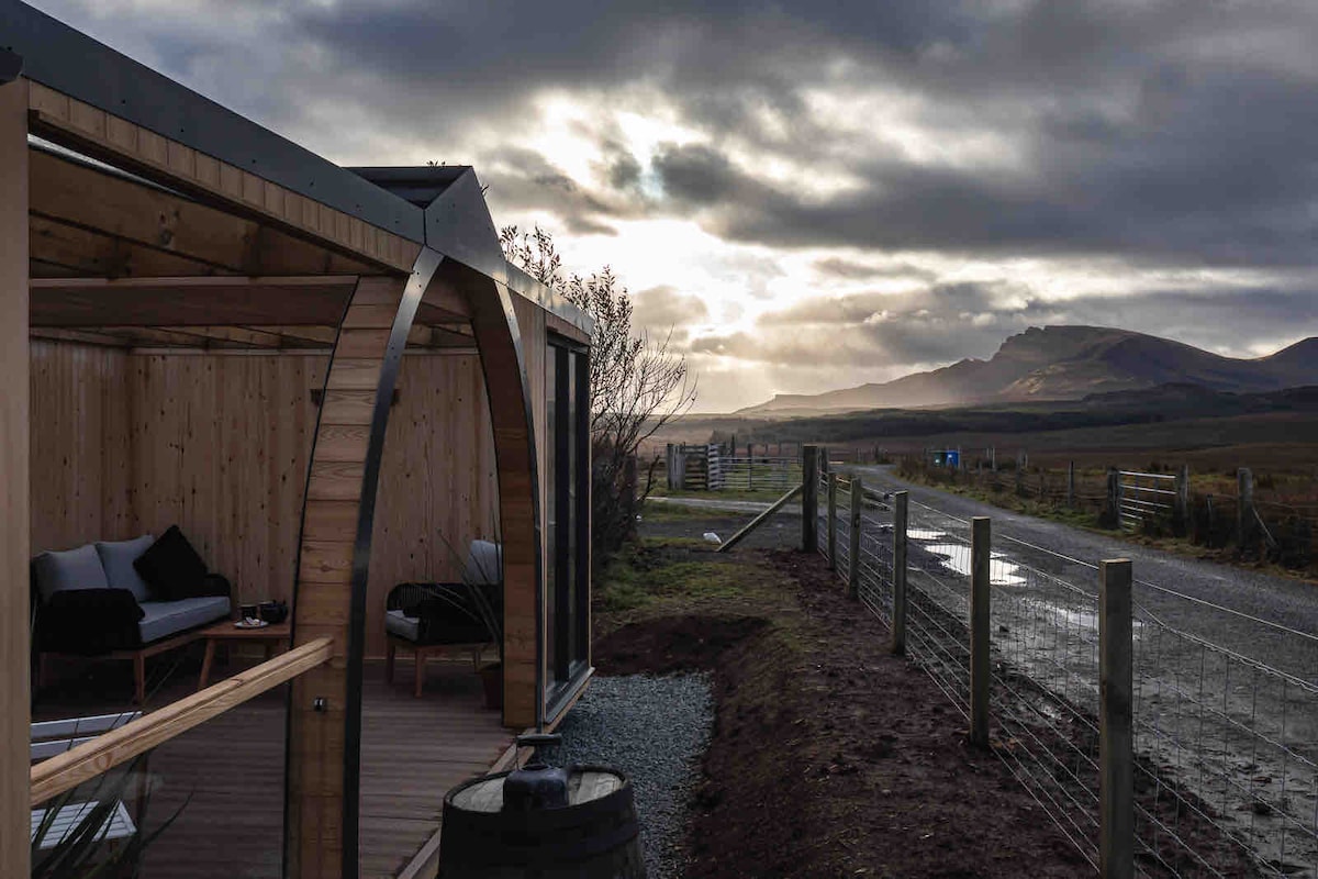 The Red Fox Retreat is the ultimate luxury glamping getaway location. A twist on the more conventional ‘pod’, the cabin features a curved wood interior entered from an arched doorway in front of which is situated a perfectly appointed king sized bed with amazing views of the Trottenish Ridge and the croft (farmland) that surrounds the property. It is warm and cosy to protect against the elements and yet light and airy. The cabin is accessed via a spectacular large undercover deck area.