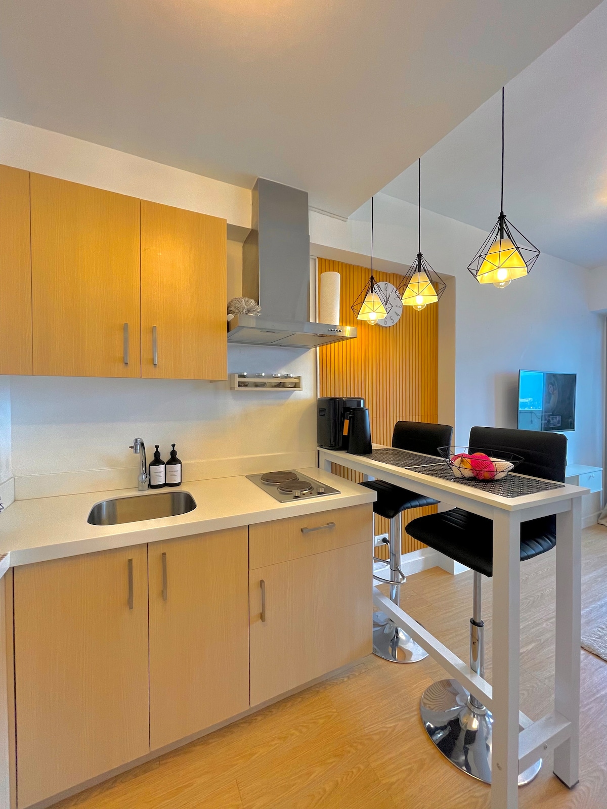Inspired by an industrial-type black & white interior with a spacious and relaxing look. One bedroom FULLY furnished condo unit with balcony, allowed to cook, heated shower, SMART TV with netflix & primevideo and spacious study/working area. Safe, secured, clean, and situated within the Urban Deca Homes Community and near establishments for your basic needs (SM Hypermarket, Restaurants, Bank, Convenience Store, etc.) Note: Parking reservation is required and subject to availability.
