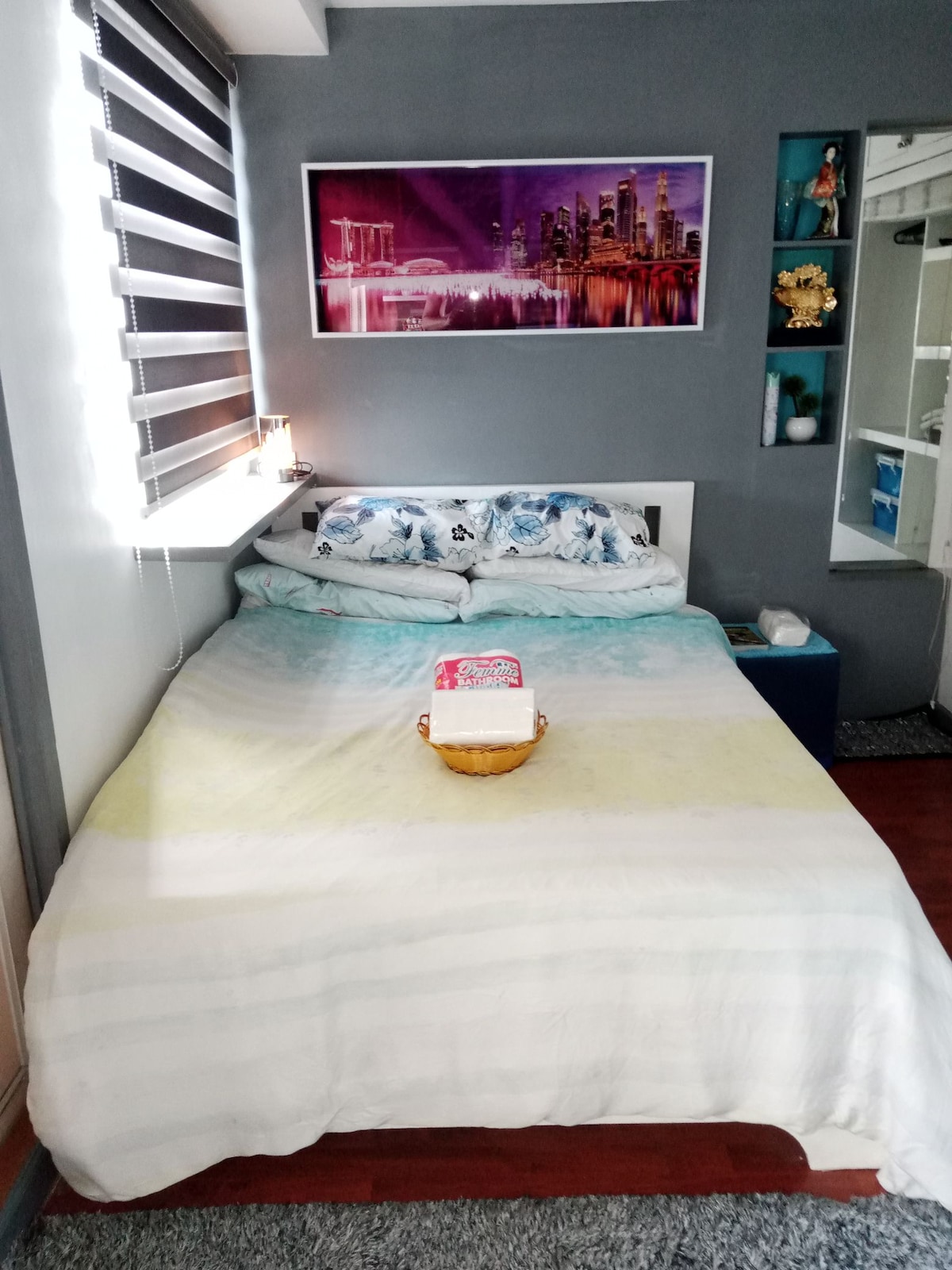 This unique place has a style all its own. Feel the NATURAL, WARM & COMFORT ambiance of my flat situatd in the heart of CONG. TOWN CTR. COND., qc. Standard clean, well kept, sanitize flat & fresh premium linens & 6 fluffy pillows. RELAXING and comfrtable QUEEN size orthopedc bed wth premium MEMORY foam topper. Fully furnishd flat wth appliances: 🔹karaoke w/ 2 mic 🔸49" smart tv wth premium netflix acct. 🔹1.5hp new aircon unit wth remote control 🔸unli wf installed 🔹hot/cold shower