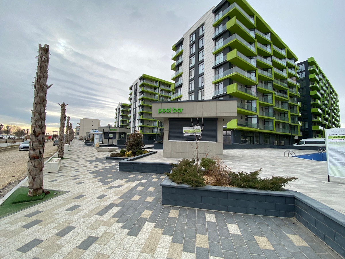 New Summer Apartment with sea view situated right next to the beach in Alezzi Beach Resort Condo, in one of the best places in Mamaia. You can choose to drink your coffee in the balcony, watch the sunrise and feel the Black Sea breeze. The kitchen is fully equipped and you are welcome to cook. Nearby you can find the most diverse restaurants, coffee shops and clubs. Our guests will have also free access to the indoor and outdoor pools, fitness gym, SPA, playgrounds and pool for children.