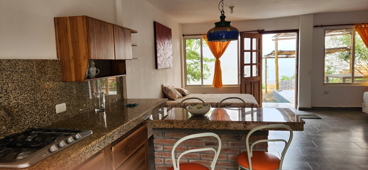 Disfruta de un espacio a metros del mar en nuestro departamento en planta alta con vista directa al océano, este acogedor espacio cuenta con dos habitaciones, baño completo y sala comedor equipada con todo lo necesario para cocinar una comida fresca. Tambien puedes disfrutar la brisa marina desde el cuarto principal con su cama de dos plazas! El segundo cuarto, con cama matrimonial, tiene vistas a una arboleda en su ventana lateral. Realmente recibes una aire fresco en todos los ambientes.