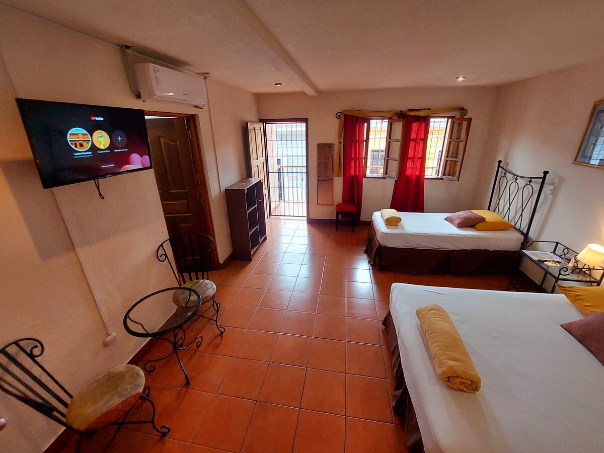🌿 Comfortable private room for up to 4 people, ideal for families or friends. It has air conditioning, a private bathroom, a large balcony overlooking the street, and free Wi-Fi. Enjoy a quiet, colonial and cozy atmosphere in the heart of Granada. Just 4 blocks from the Central Park and close to restaurants, bars and markets. Parking is available nearby. We look forward to seeing you!