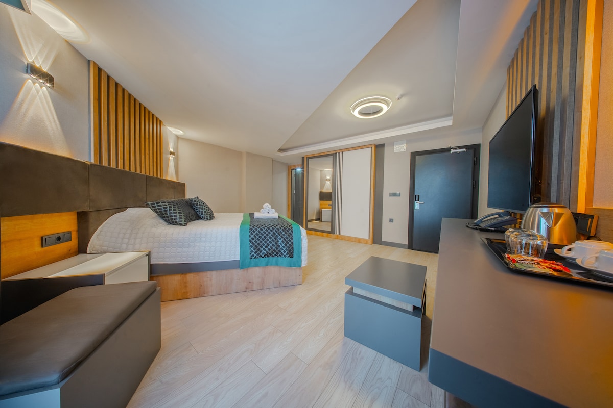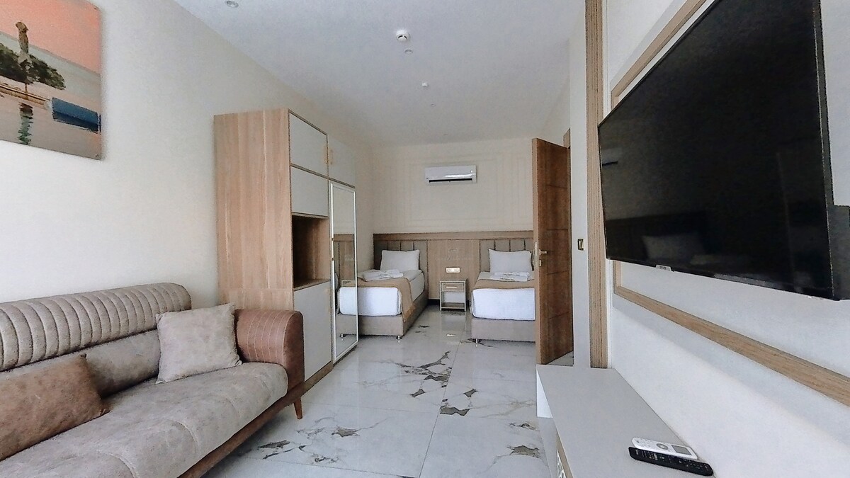 Room Features: • Large and spacious rooms for 2 and 3 people • Air conditioning, Wi-Fi, TV, mini fridge, wardrobe • Private bathroom and balcony Hotel Features: • A quiet and peaceful environment • Optional breakfast and meal service • 24/7 reception and security • Easy access to the beach and center Perfect Location: • Close to The Land of Legends Theme Park • Adjacent to golf courses • Walking distance to markets, restaurants and cafes • 30 minutes from Antalya Airport