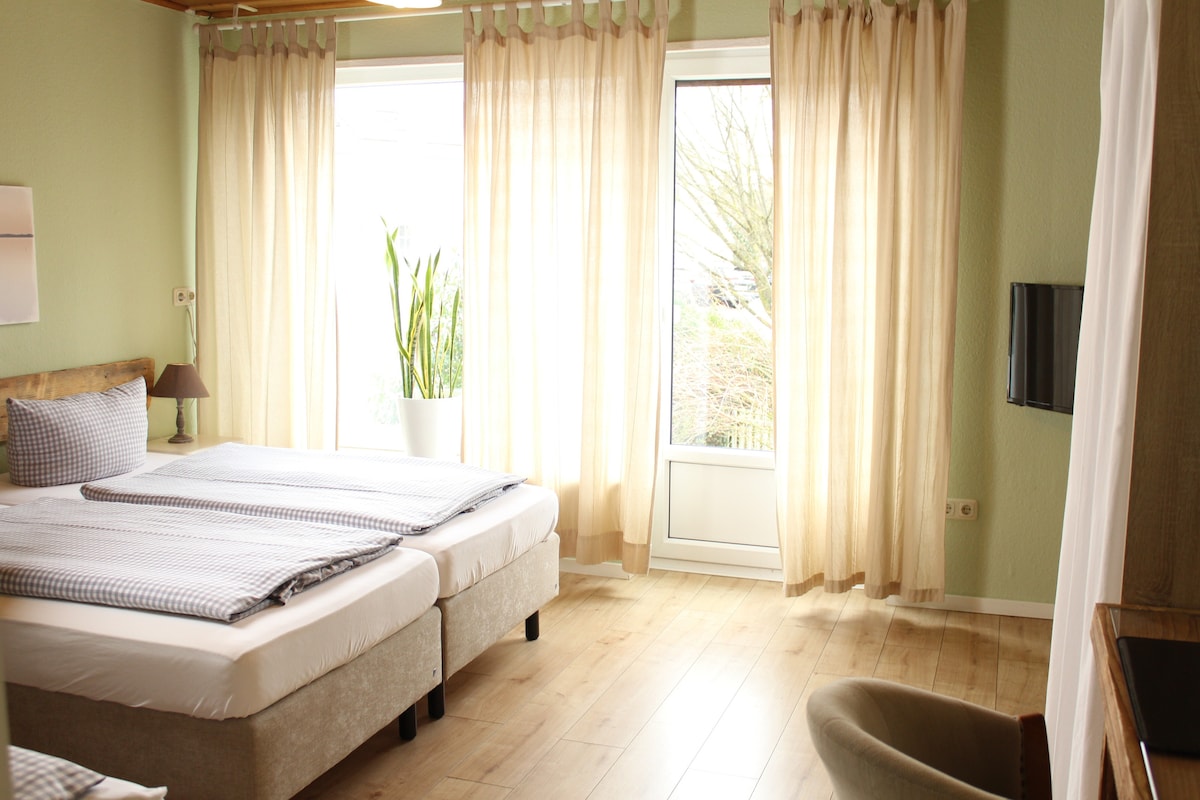 In our small, individually furnished guesthouse "Haus am Bach" in Allershausen, you can relax in a cozy box spring bed after a strenuous day. Each room was individually designed and furnished by us. In the morning you start your new day with a delicious breakfast with a view of the idyllic “Glonn” stream.