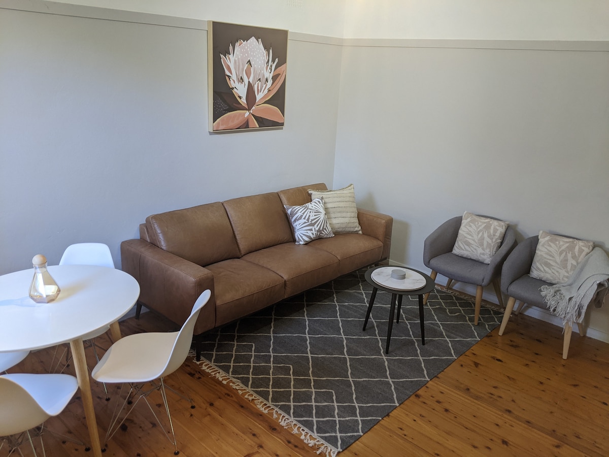 Newly renovated , architect designed apartment set amongst trees with views over the city to the ocean. The apartment has an open plan lounge ,dining and kitchen area with a comfortable sitting space and work desk which opens onto a sunny wrap around verandah, accessed through timber sliding doors. One of 2 ground floor apartments, completely private Owners live upstairs Several flights of stairs through garden to entrance. No handrail. Not recommended for guests with mobility issues