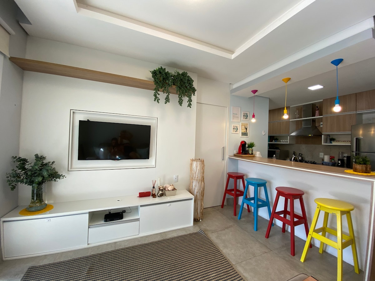 Relax with the family in this beautiful new apartment, with swimming pool, gym and kids space, on Xangri-Lá beach. Complete bed and bath set to accommodate up to 4 guests comfortably. Located in the quiet Santorini neighborhood, which has soccer and beach volleyball courts, squares and playgrounds, and just 5 minutes from the waterfront and downtown. We provide beach chairs and umbrellas. Arrive only with your bags, the rest will be ready for you!