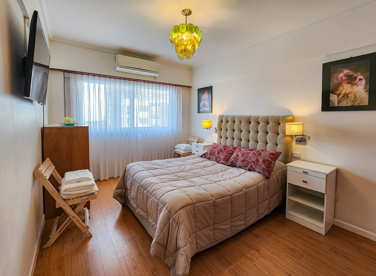 Comfortable and bright apartment overlooking Plaza Mitre. Located one block from Av. Colón and 9 blocks from the city's beaches. All the amenities: balcony, air conditioning, boiler heating, washing machine, iron, dryer, microwave, coffee maker, TV, WIFI. You'll feel super comfortable! Lots of light, great view, everything to make you feel at home. Close to different tourist attractions and shopping malls in the city. The area is safe and with movement throughout the day.