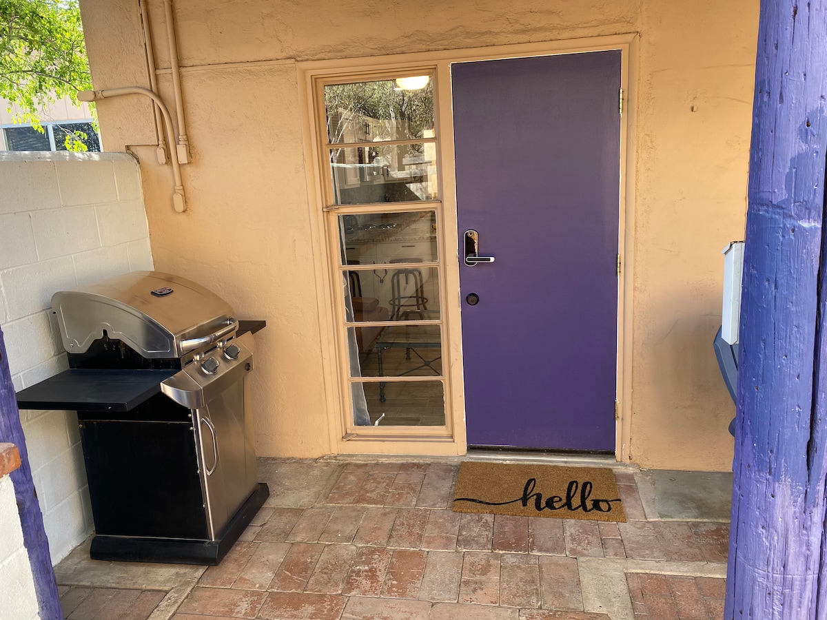 Family friendly (with ungated pool) 411sq ft Private Casita newly REMODELED! Sleeps up to 4. King feather bed & a pullout queen sleeper. Located just past a quaint garden where you can catch hummingbirds drinking. Private parking & entrance, just come and go. ASK ABOUT: Our other King Suite just feet away! Can sleep additional 2 guests! Cool off in pool, use outside patio (where cooking station is located, there's no kitchen in the casita). Min. from I-10 & stellar Tucson Biking Loop!!