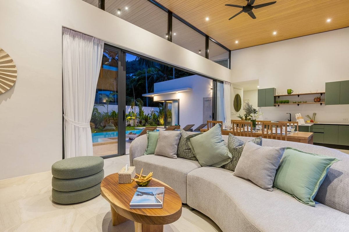 Step into the serene elegance of Villa Green Palm, a beautifully designed 3-bedroom villa that blends modern comfort with lush tropical surroundings. Located just moments from the beach, this villa features expansive open-plan living with natural light. The fully equipped kitchen features sleek cabinetry, modern appliances, and a generous dining area perfect for gathering with family or friends. *Important noted* Extra Charge Electricity 5 THB/unit