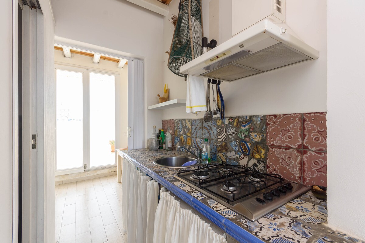 Furnished in a vintage natural style, the house consists of a studio with a kitchenette and a bathroom with shower. It is accessed from a gate overlooking a courtyard. The apartment is bright, overlooking the marina of Favignana overlooking the castle of Santa Caterina, and is equipped with air conditioning. The kitchen has the essentials for preparing breakfast and small meals.