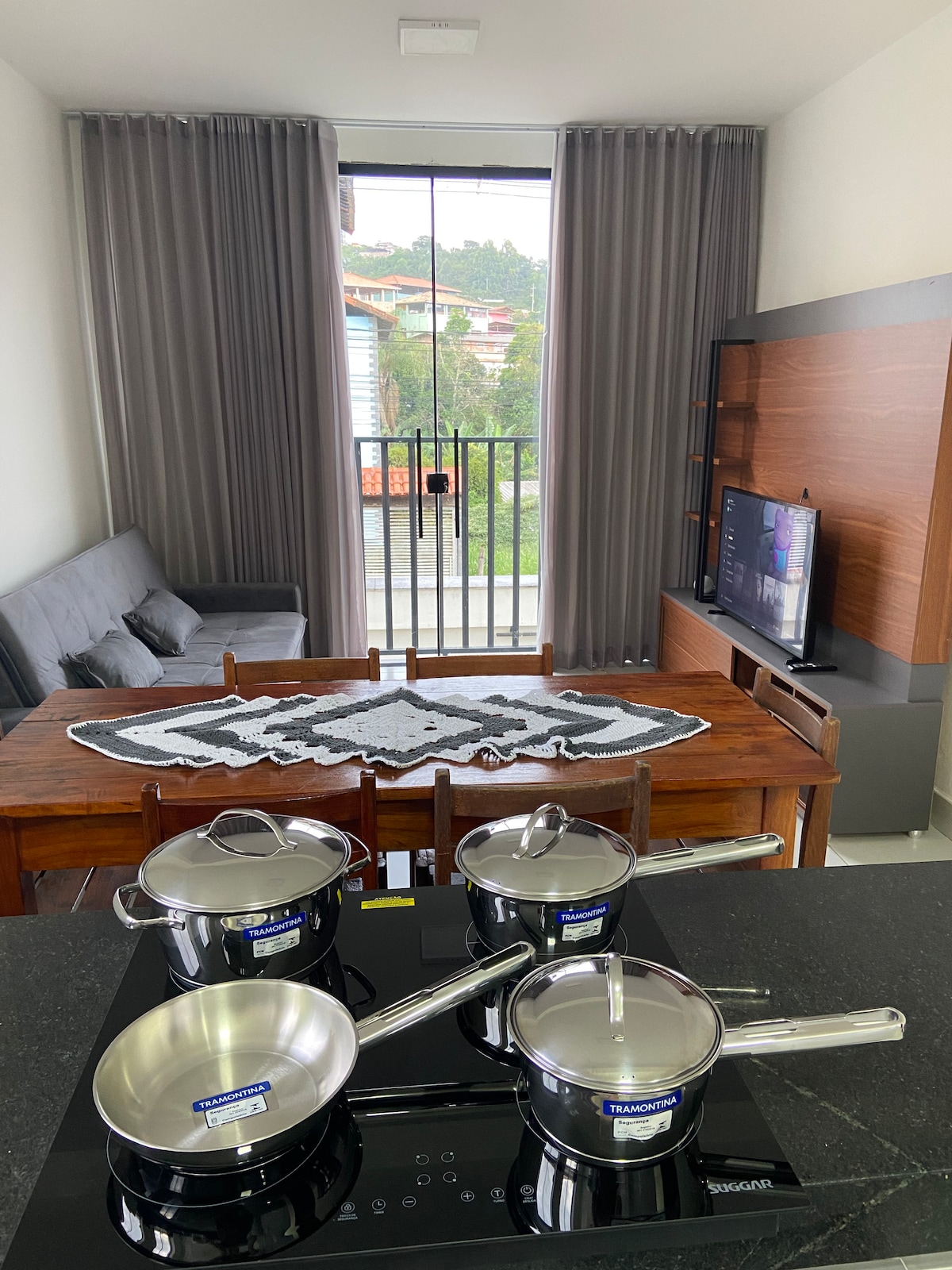 Apartment with elevator, brand new in Ouro Preto. With 2 bedrooms, 1 suite and 1 social bathroom. Full kitchen with microwave, refrigerator, induction stove, water purifier, kettle, mixer and electric rice cooker, iron, fan in the bedrooms. Laundry with tank, washer and dryer available for guest use. Garage for 1 car with electronic gate, in a safe and quiet place. In front of the Cooperouro Supermarket and the BH Supermarket. Next to Santa Casa.