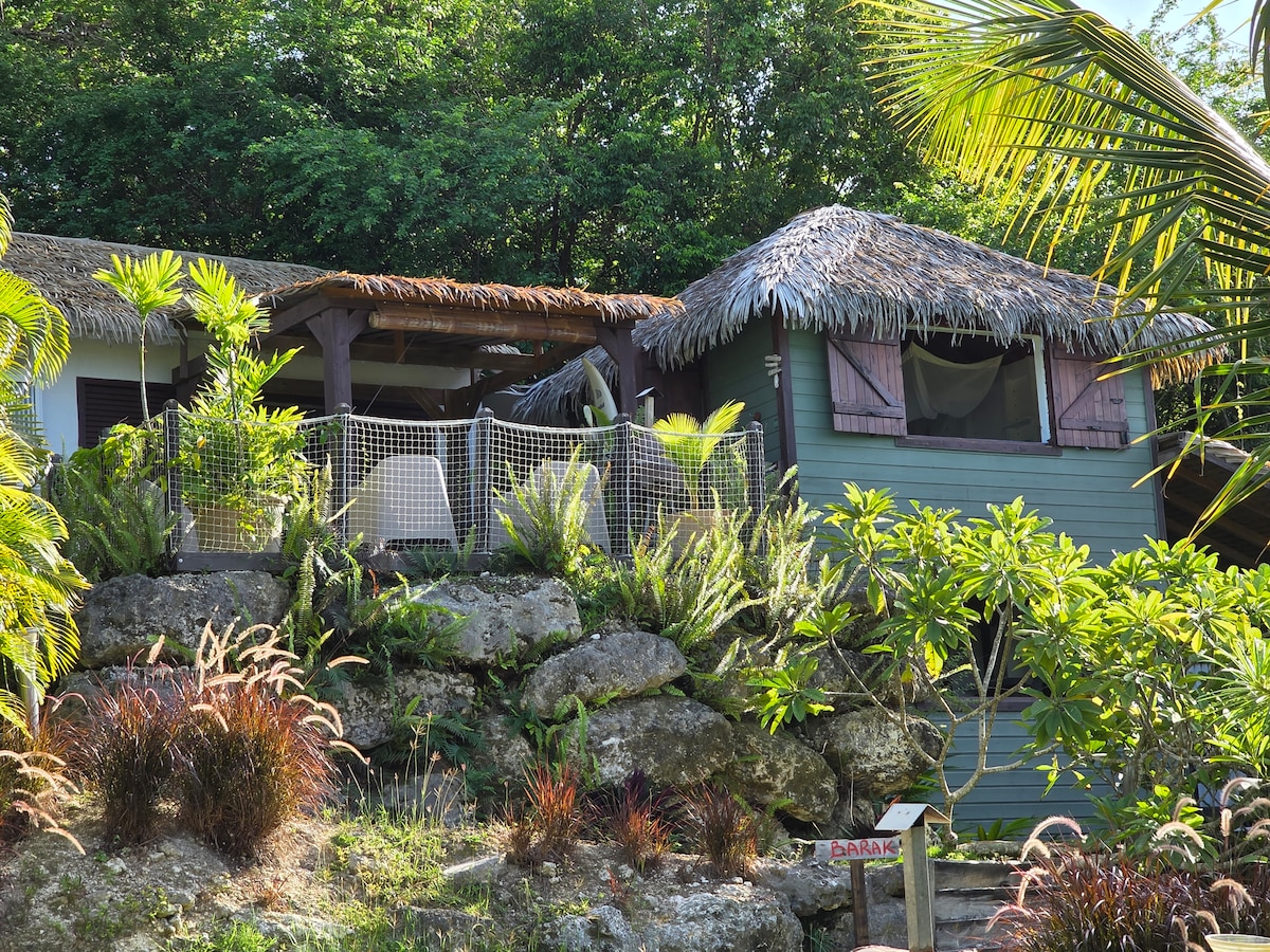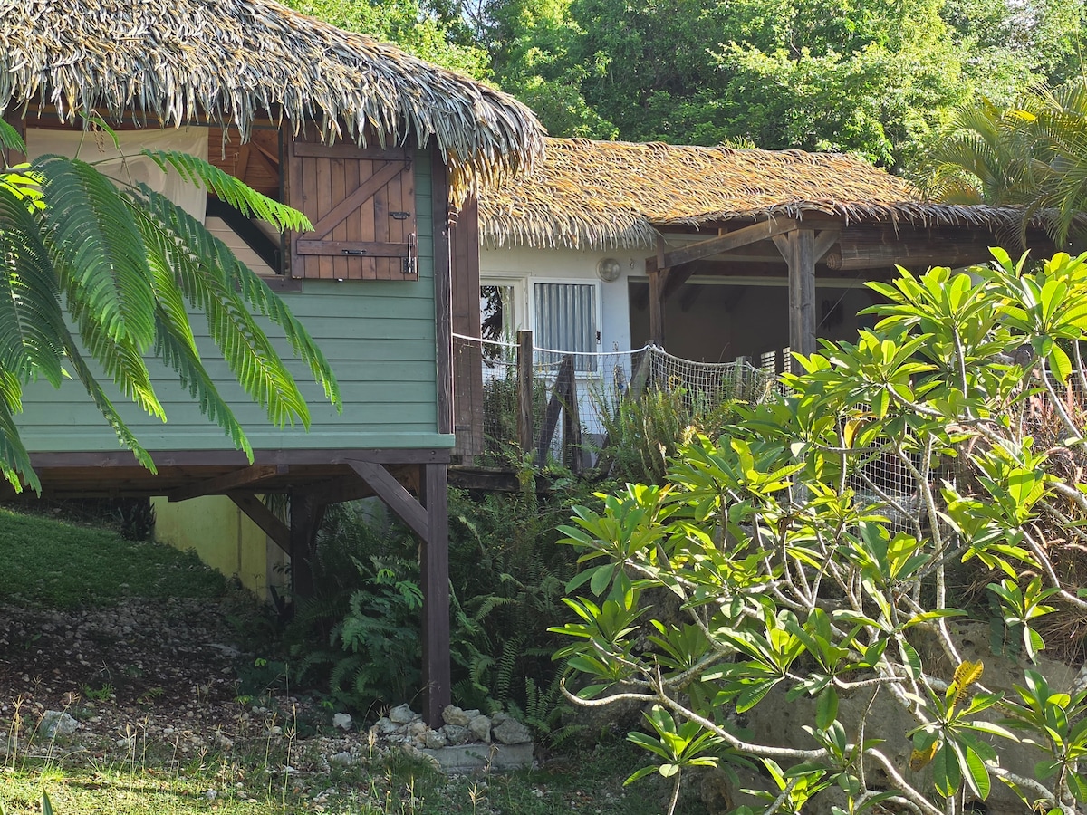 In the heart of the tropical garden of L 'Écolodge La Kabane, a stone's throw from the lagoon des Basses, the Karbet is a large wooden bungalow, with a palm roof, with sea views, composed of two identical mirrored bedrooms, cabin spirit, with 140 beds, mosquito nets and wall fans, separated by a classic bathroom, and an outdoor tropical bathroom, very original, backed by the bungalow and discreet, in the heart of the garden.