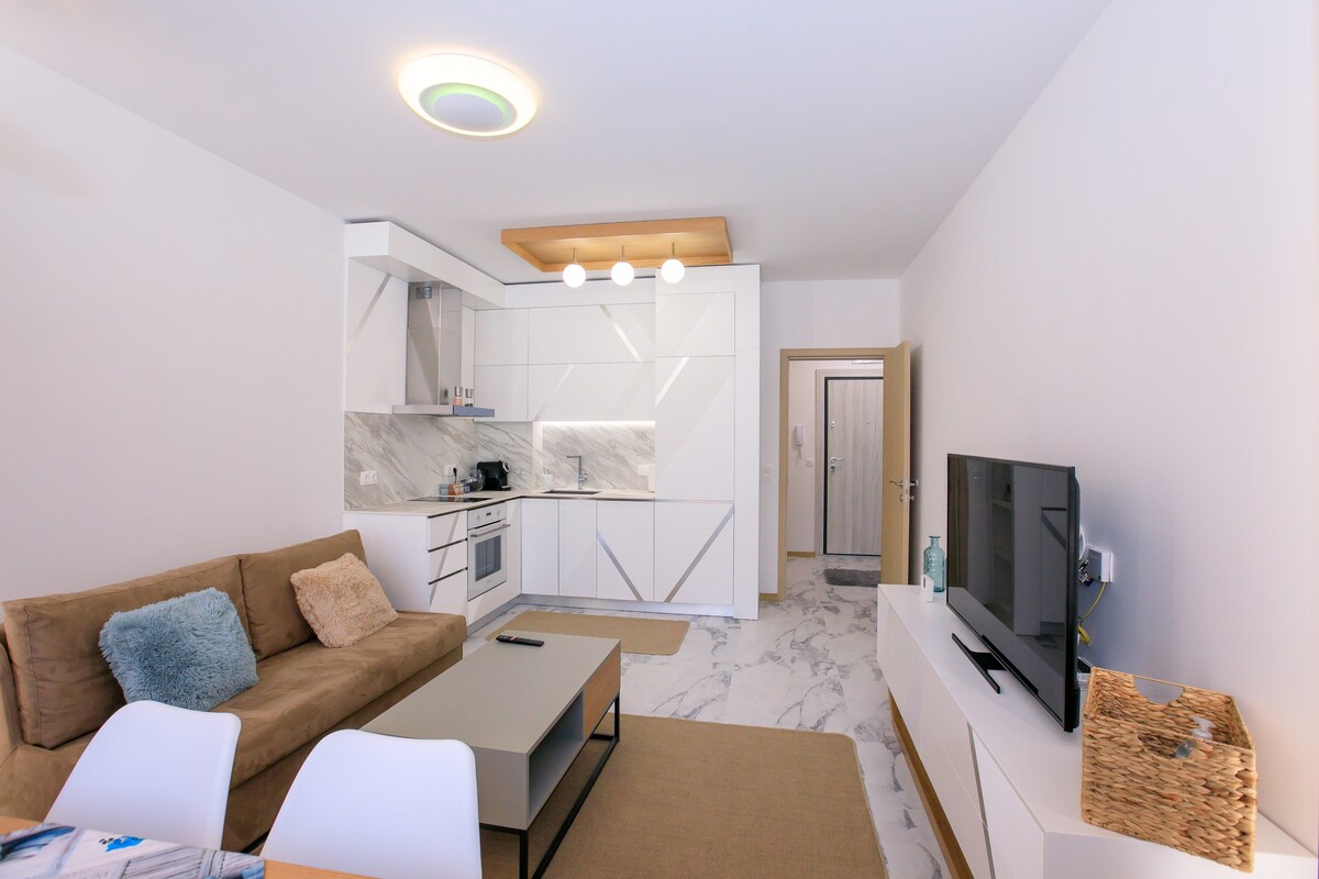 New, bright and stylishly furnished apartment in a newly built building. The apartment is located 20m from the central city street. The apartment has a kitchen, 1 bedroom, a bathroom with a toilet, and a terrace. The sofa in the living room is stretched and is suitable for children up to 8 years old. A crib is available upon request. Free and fast internet and cable TV. Secured parking spot. The building has an elevator.