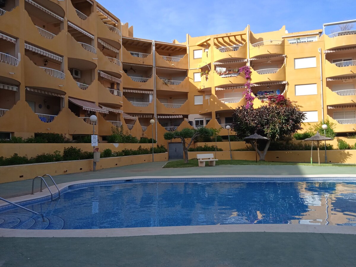 Apartment in a residential development with a swimming pool next to the beach.