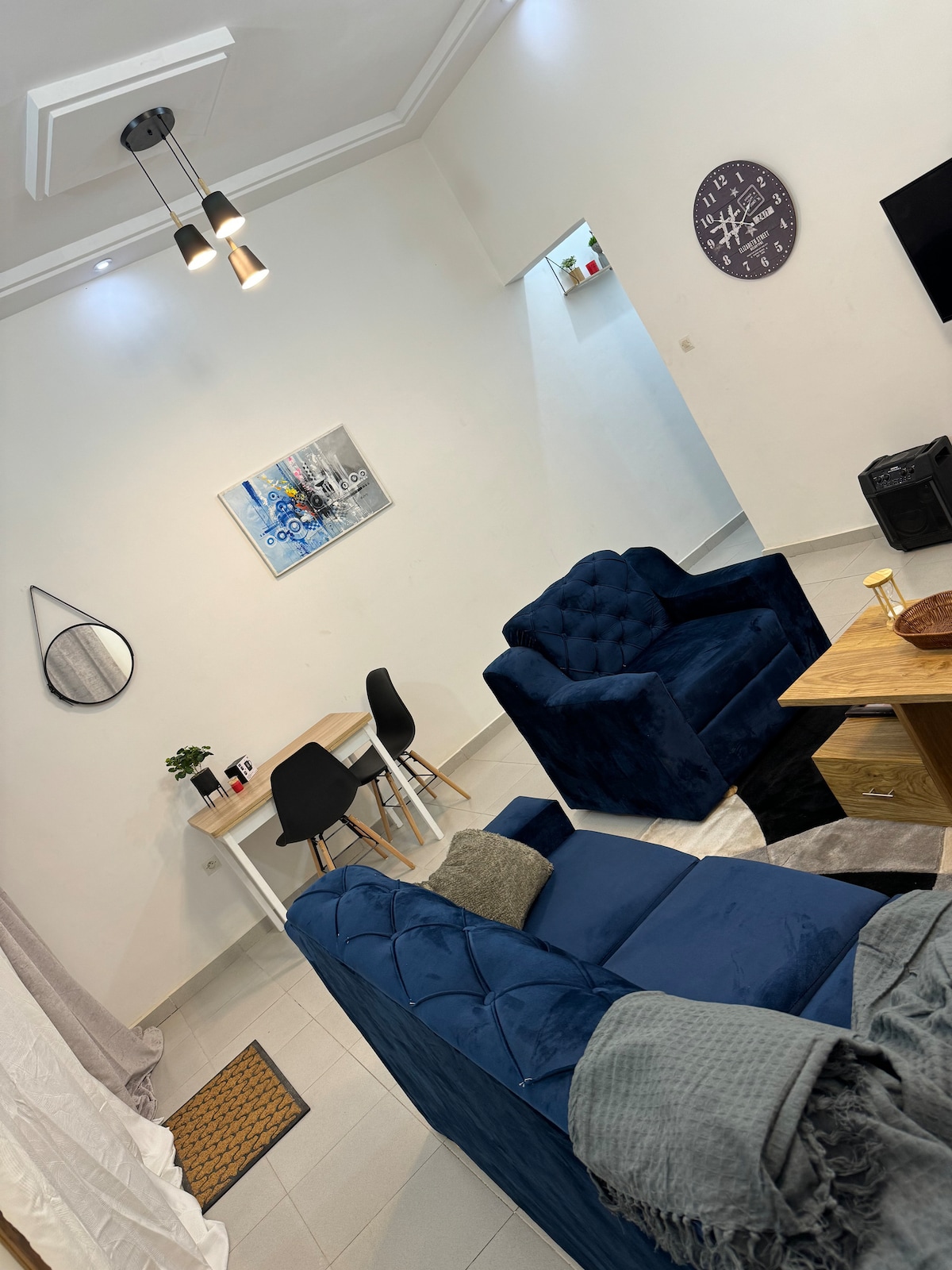 1chambres meublées climatisées 1 salon meublée climatisée 1 cuisine equipéesalles de bain 1wc 1 balcon 1 garage 1 jardin Television ecran led avec antenne parabolique , plus de 150 chaines Home cinema Wifi gratuit eau gratuit électricité : cash power( vous payer ce que vous consommez)