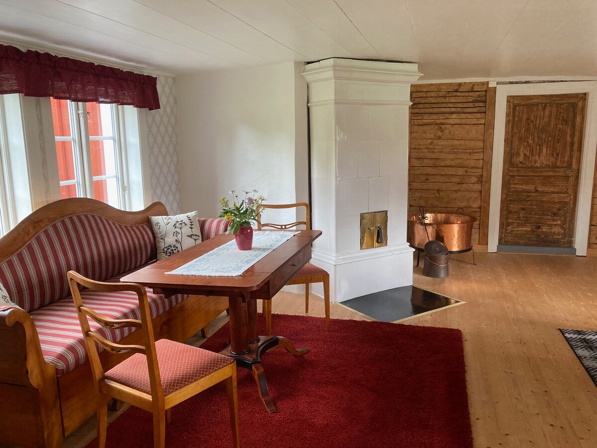 Have you always dreamed of a small cottage in the woods? Here you will find a unique little cottage from the 18th century. Here you can listen to the crackling of both the tiled stove and the wood stove. There are beautiful walking trails and exercise trails in the forest and a small forest lake very close by. There are sheep in the meadows all year round and the cottage is located a bit away from the farmhouse where a family with children lives. On the farm, there are also other animals such as cats, chickens and ducks.