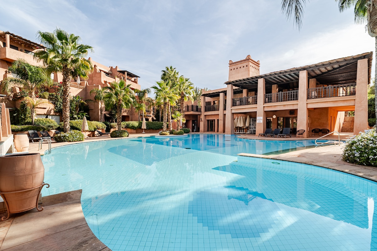 🌴 Welcome to Prestigia Golf ⛳️ Oasis o A stylish 2 bedroom apartment in the exclusive Prestigia Residence 🌟 , steps from Montgomery Golf. Enjoy resort-style pools 🏊♀️ , lush gardens, and a private terrace to unwind. Just minutes from Marrakech Medina and the airport 🛩️, it’s the perfect mix of comfort, elegance, and tranquility for your stay 🧞♂️✨ Exclusively for families 🧑🧑🧒🧒 Close to airport ✈️ Occasionally, you might hear airplanes passing.