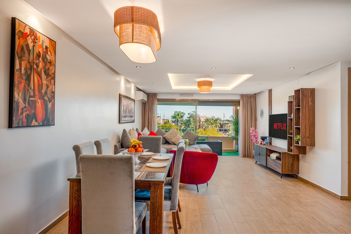 3 Bedroom stylish apartment in Prestigia Golf Resort right in the city center. Niched in a perfect location, very close to the airport, and only a few minutes away from the Medina, the Mamounia, M Avenue and Hivernage. Enjoy a gigantic smart TV for Netflix, comfortable bedding and amazing views on the golf overlooking the Atlas Mountains. The apartment is inside a golf residence with security, a club house, pools and a golf course with breathtaking views of the Atlas Mountains.