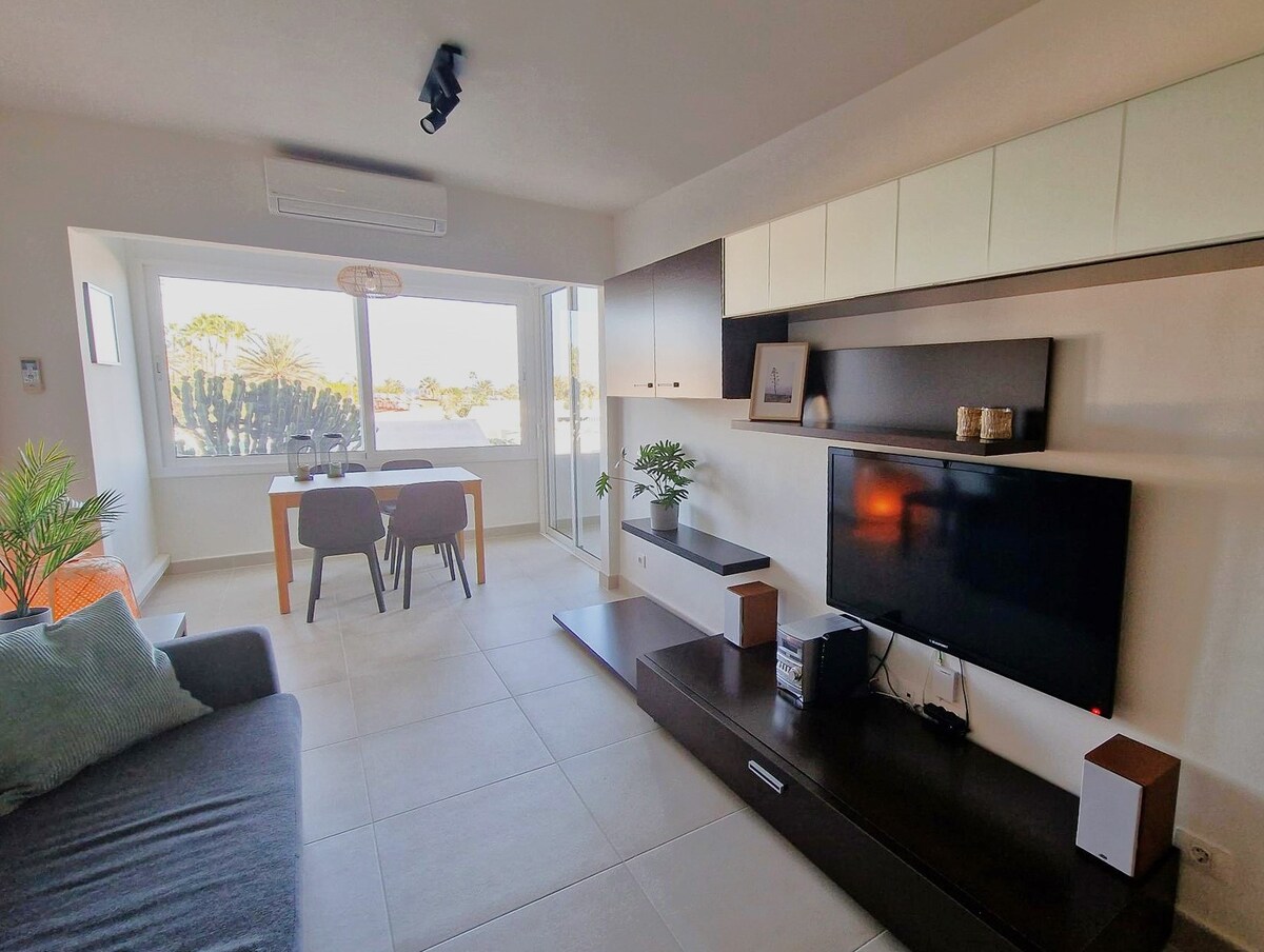 Bright, renovated and fully equipped, this south coast apartment is ideal for longer stays. Spacious and airy thanks to its great orientation, it stays comfortable all day. Enjoy a pool view terrace, two 1 x 2 m hotel style beds, a sofa bed, WiFi, 2 Smart TVs, plus a kitchen with oven and microwave. The complex offers a pool and free parking. Close to Kasbah, Yumbo and Águila Roja, with supermarkets nearby and easy bus and taxi links. Perfect for seaside walks, swimming and exploring the island.