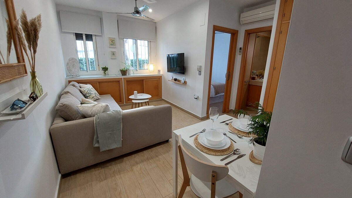 Nice apartment on the second row of the beach. It is newly renovated, with everything you need to spend a few days relaxing and feeling the sea breeze every morning. It consists of a large bedroom with a 1.50m double bed, a living room with a 1.35m double sofa bed, a bathroom with a shower, and a separate kitchen with a dishwasher and washing machine. Has Wi-Fi The apartment is on the ground floor of a small development on one of Rota's main leisure and restaurant avenues.