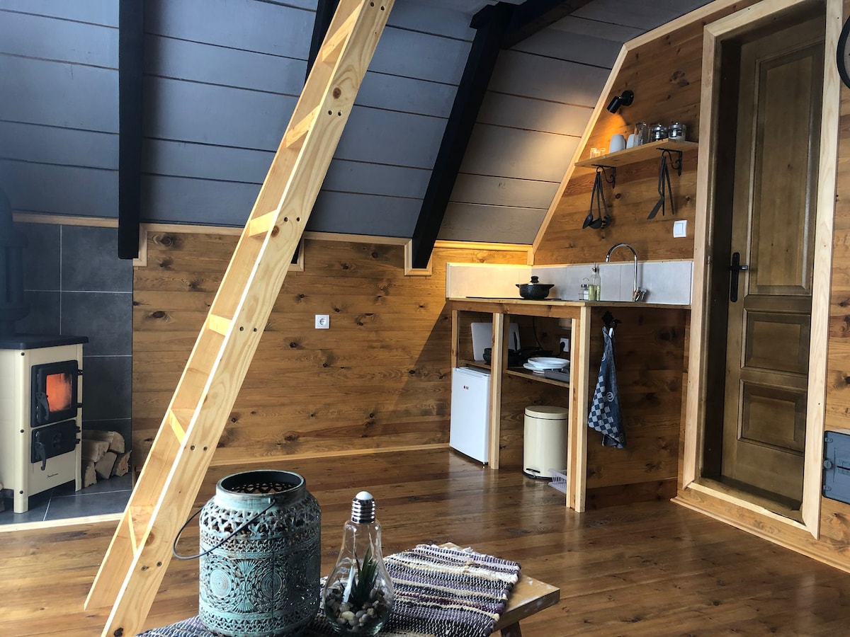 This wood cabin is standing on the top of our property. From this place you have the best view. At every side of the house you can see the mountains on there best. When you look at the pictures you can see that the two-personsbed is only available with a little stairs or you can sleep on the sofa bed downstairs. There is a place where you can make fire and make dinner on a bbq. at the terras we will serve breakfast every day from 1 mei till 1 oktober