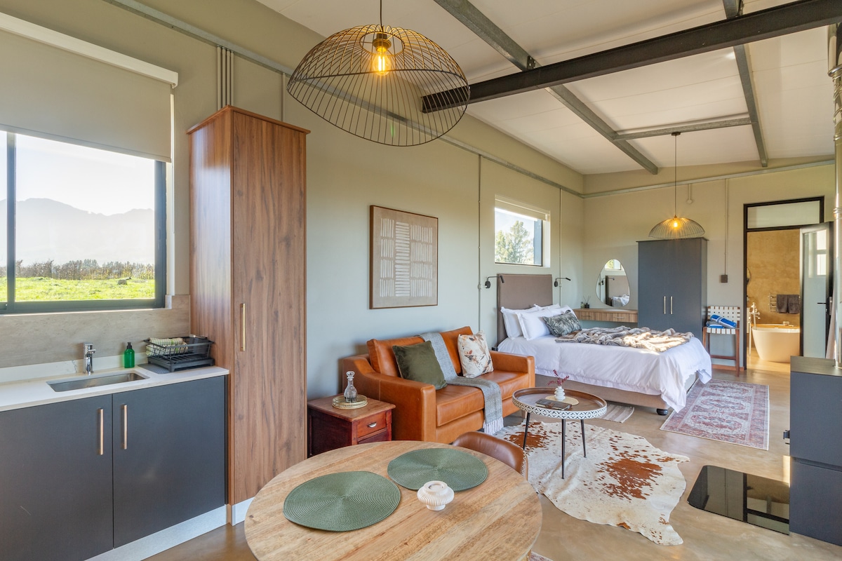 Enjoy the sights and sounds of nature when you stay in this unique eco home, designed with biophilic principles. We’ve chosen natural building materials like hemp walls, 100 year old recycled Oregon wood and handmade eco-paint to increase our connectivity to nature & tread lighter on our planet. Double glazed glass helps regulate. Overlooking our farm dam, with trees to rest under and the majestic Winterhoek mountains as a picturesque backdrop - our cottage is the perfect weekend getaway.