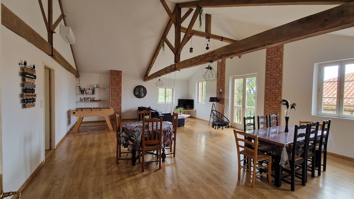 Forget your worries in this authentic, spacious and serene accommodation. Nestled on the first floor of an old Gascon farm, with a beautiful cathedral living room, completely renovated, this accommodation will welcome you for your vacation. A beautiful hanging terrace and a sheltered winter garden with its high-end 5-seater spa will be ideal for your relaxation. You also have access to an outdoor garden and a pétanque court. The barbecue will delight you and the bikes will take you on a ride.