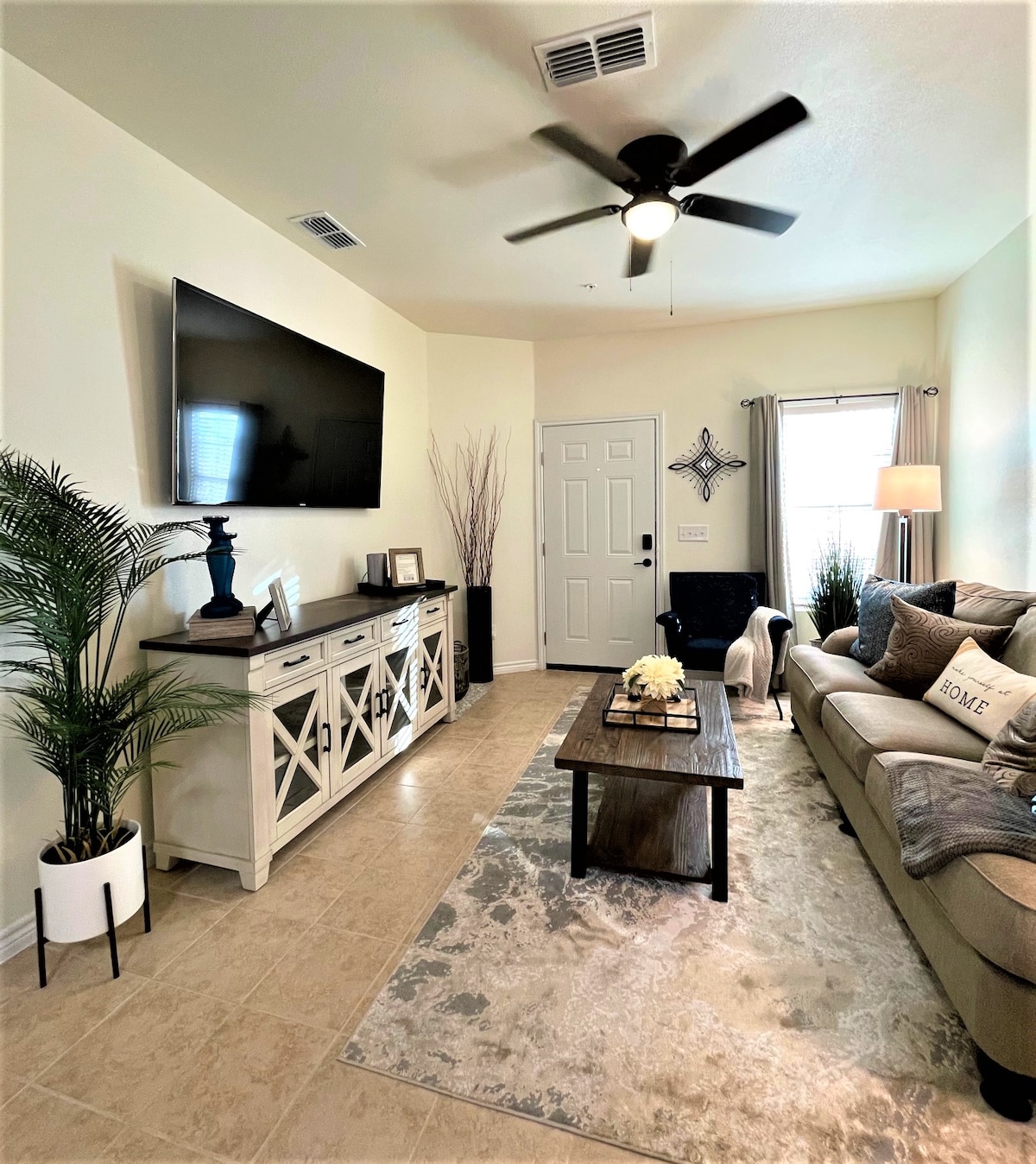 The open-concept living area features a comfortable sofa and a 50" smart TV on a low cabinet. A ceiling fan is present above, while a dining area and kitchen with bar seating are visible in the background. Natural light filters in, enhancing the welcoming atmosphere.