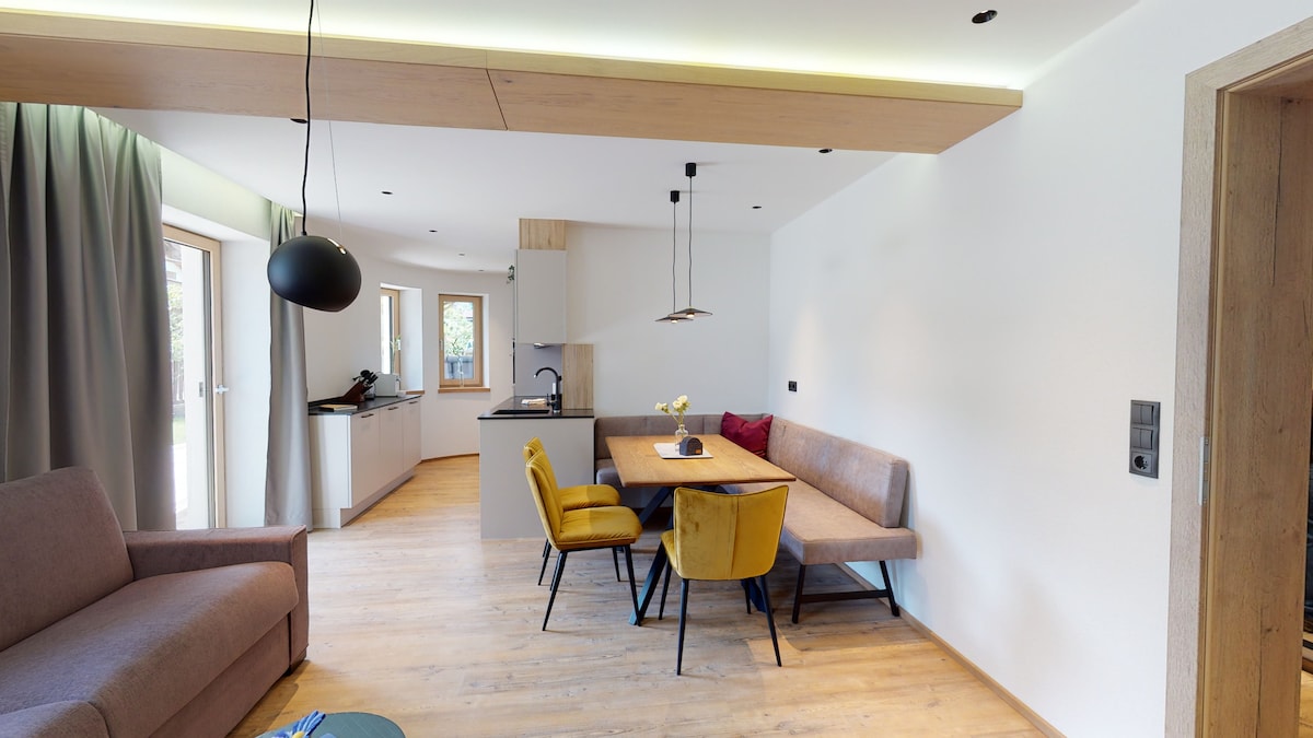 The 150m² holiday apartment is ideal for families who want to holiday in the mountains and in nature together with grandparents, grandchildren or friends. Groups of friends up to 10 people will also be happy about this spacious, modern apartment. Breakfast can be booked next door. Bakers, shops and an indoor swimming pool with sauna and train station can be reached on foot in just a few minutes. Relax by the fireplace or on the large balcony patio. - with e-charging stations