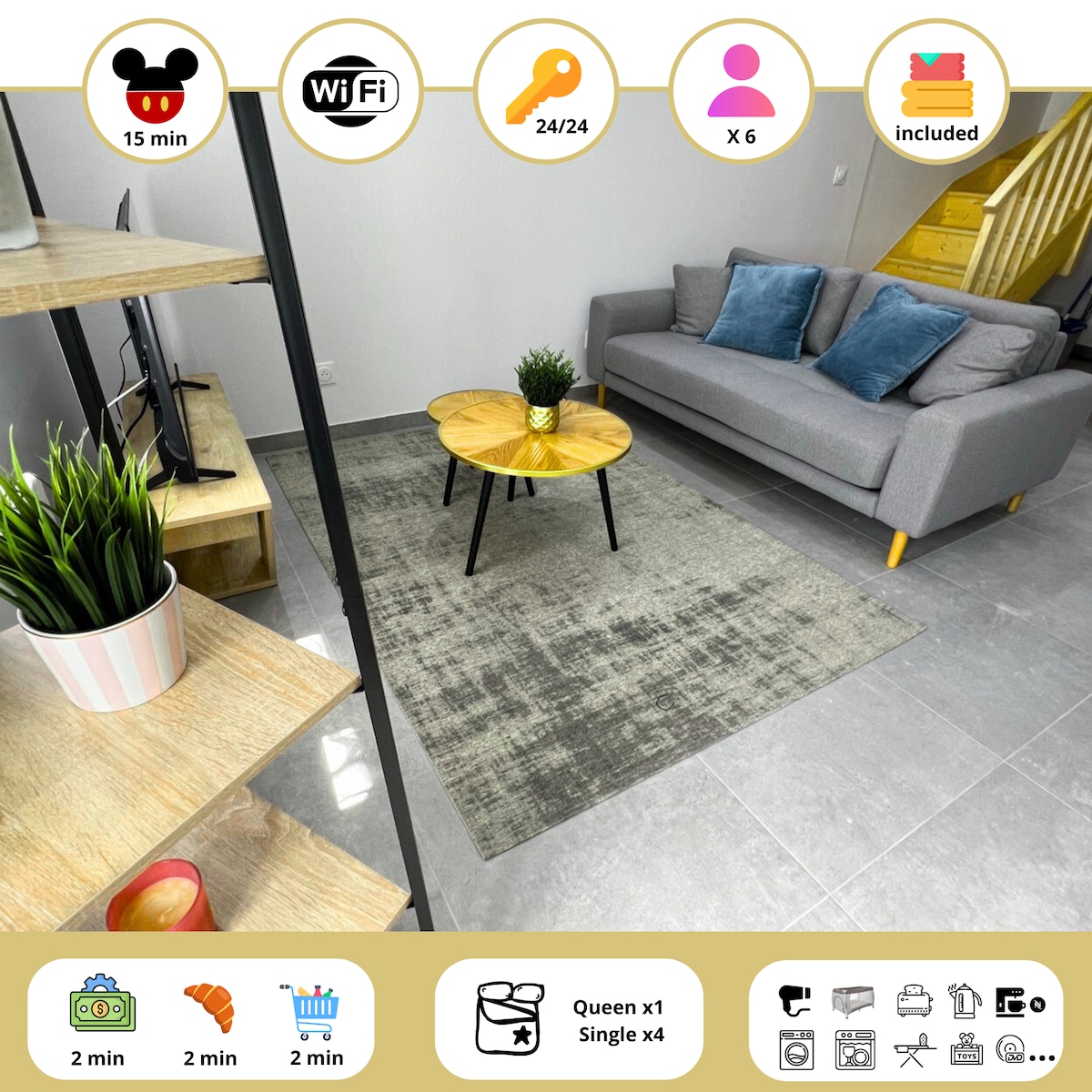 Best area with a cozy new flat ideally located at Val d'Europe, near Disneyland Paris: - Access to the park: 25 min on foot, 10 min by car, taxi/Uber or via RER located 600 m away. - Access to central Paris in 40 minutes via RER. - 700 meters walk from the Val d'Europe shopping center, Vallée village outlet. - Direct proximity to all shops (Carrefour, bakery, brasseries, Japanese, Italian, burger, Korean, etc.). - View of the Tower of Terror and its drone show from the terrace in the evening :-)