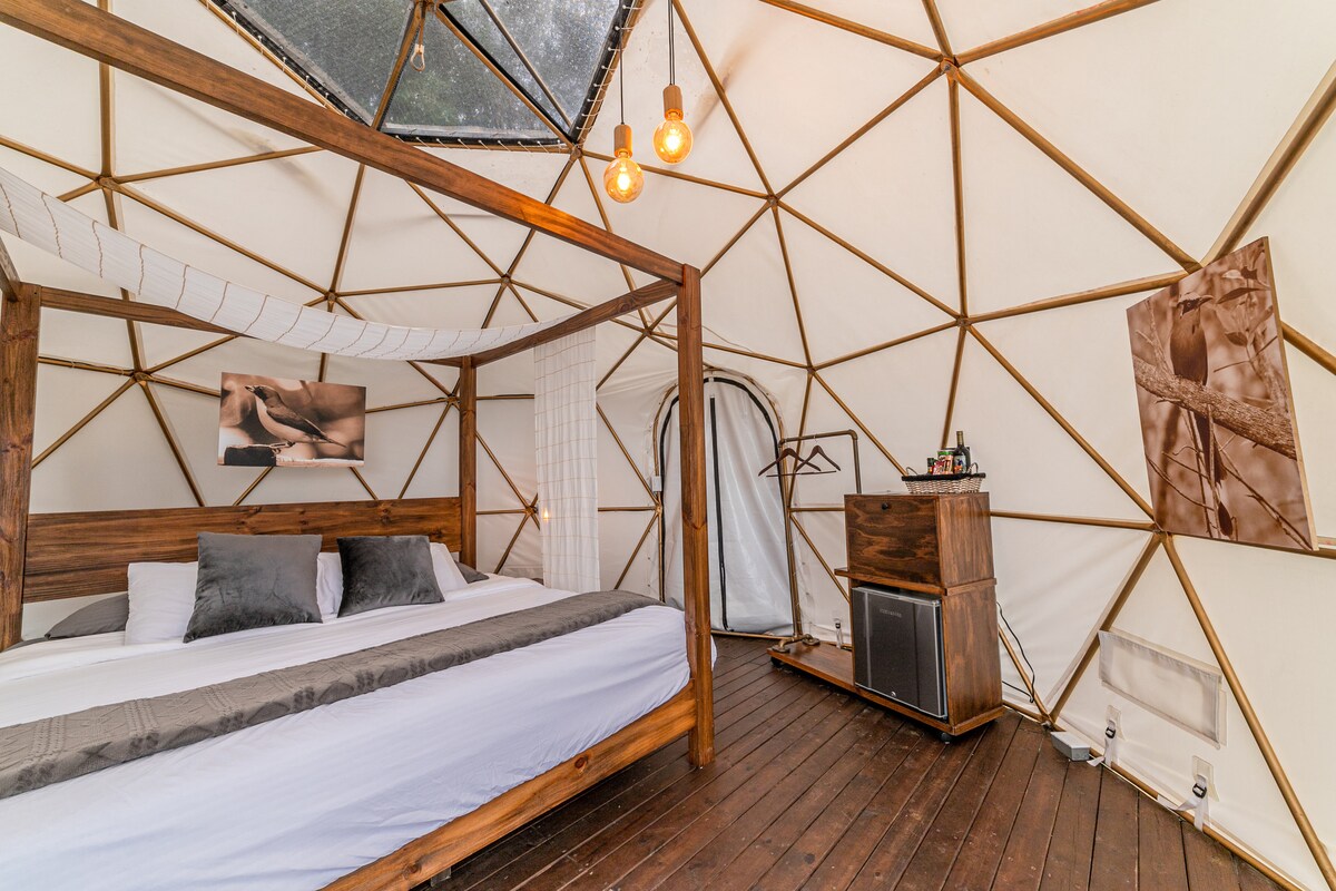 Discover the serenity of our exclusive Glamping in the heart of nature. Each cabin offers top-notch amenities such as a spacious king-size bed, private bathroom, barbecue, refrigerator, and a hammock to relax outdoors.