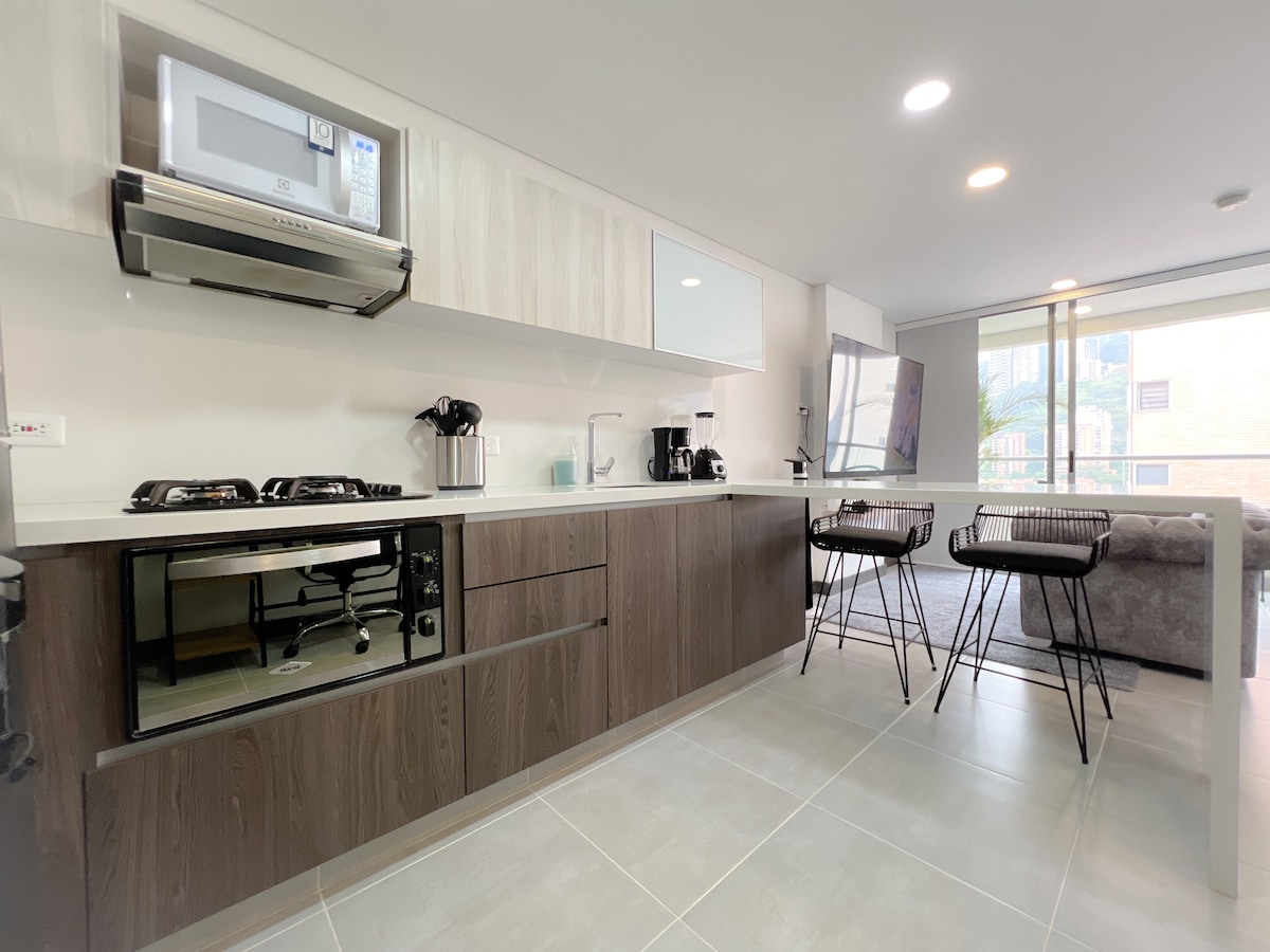 RECENTLY RENOVATED -High-speed internet great for remote work -Brand new A/C -Fully renovated Industrial design apartment -King size bed -Breathtaking views of Medellín (trust me, worthwhile to stay here) -19th floor -Unbeatable location in Poblado near to Provenza and Lleras Park -Modern amenities -Spacious living area -Smart TV x 2 -Fully equipped kitchen -Washer & Dryer Tower -Pool -Gym -Coworking space -Restaurant inside the building -Private parking -Self check-in -24/7 Security