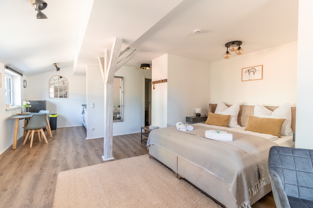 Welcome to the bright and new 40 sqm studio apartment at the Schlössbrücke, which offers you everything you need for a great stay in Meißen: > King size bed (1.80 m x 2 m) > Couch, smart TV, 50 Mbit/s Wi-Fi > Fully equipped new kitchen > Filter coffee machine and tea > View of the cathedral and access to the castle bridge *Fantastic location, monument 17th century, clean and tidy, contactless check-in, friendly and fast communication.*