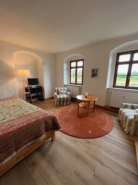 The fully furnished apartment with terrace is located on our three-sided courtyard. You have a self-contained apartment / 40 m². The 2 beds are 1 m wide and 2 m long, 1 sofa bed is 2×2 m and is very comfortable as a 3rd bed. Hiking in the vineyards of Seußlitz, relaxing in the Goltzscha natural pool in summer and using the Elbe cycle path just 400 m away make you want more. Parking spaces and 2 bicycles are available free of charge. Your own bicycles are safe in our courtyard.
