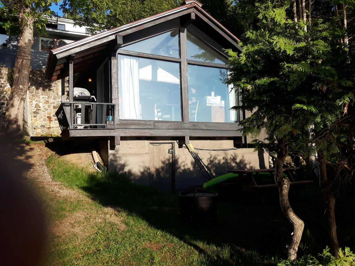 This unique property is right beside the lake, water on 23 sides of the covered deck. Cozy, romantic awesome views and incredible sunsets facing south so sun all day. Bedroom with 8' patio door looking onto the lake and your private covered terrace. Hot tub, 15 steps away. Main floor has full kitchen, two dining areas one looking at the lake. Dogs (quiet and non-aggressive) welcome. CITQ #298403