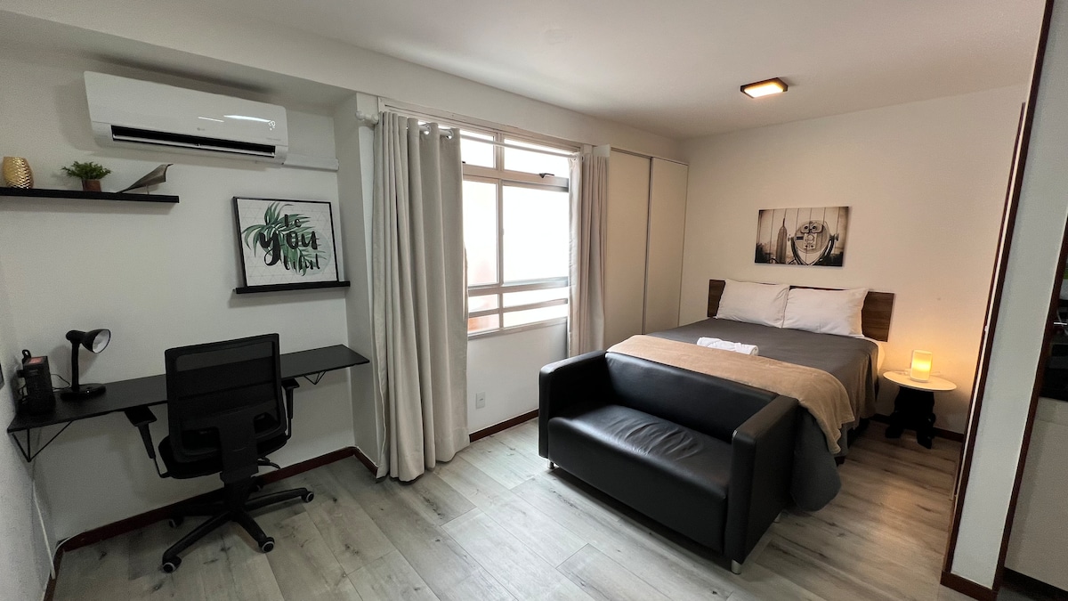 Embrace style at this peaceful and centrally-located place. The "Praiana" unit is your place with style, tranquility and a perfect location in Brasília. It is located in the Plano Piloto district and is a short walk from a supermarket, restaurants, a 24-hour pharmacy, bakeries, a salon, and cafeterias. We provide a washer and dryer in the unit. It is a SMALL space (18 m²) that has everything you need. Equipped kitchen, hairdryer, iron and unique decor. Decorated by design!