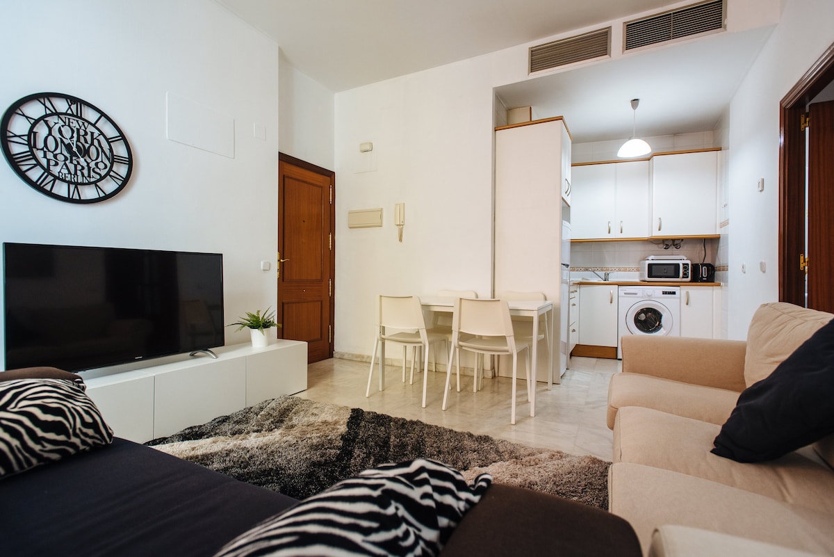Spacious, modern and comfortable apartment recently renovated and fully equipped, decorated in detail; it offers an ideal space to spend a pleasant stay. Enjoy the comfort of a spacious apartment with a contemporary aesthetic located in the heart of Seville. Its spacious and bright rooms create an elegant atmosphere. Located on a pedestrian street, without noise, with a balcony onto Calle Francos where numerous brotherhoods pass during Holy Week. A three-minute walk to the cathedral. An apartment located in a very quiet building, perfect for resting after a long day of sightseeing. First floor with elevator. It has a bedroom with a 1.50 x 2.00 bed, a large built-in closet, a TV, and a crib available if necessary. Spacious and comfortable bathroom. Kitchen equipped with everything you need (pans, pots, cutlery, etc.) complete tableware and all kinds of appliances (washer-dryer, dishwasher, refrigerator, ceramic hob, microwave, oven, kettle, toaster, sandwich maker, juicer, automatic and Italian coffee maker, hand blender, blender, liquid blender, iron, ironing board) all in perfect condition. Spacious and bright living-dining room, WiFi internet, 50 Mb fiber optic, smart TV, comfortable 1.40 x 1.90 sofa bed, very comfortable mattress for daily use, easy to open and close. Apartment located in a very quiet building, perfect for resting after a long day of sightseeing. First floor, with elevator. It has a bedroom with a 1.50 x 2.00 bed, large built-in wardrobe, TV, crib available if necessary. A spacious and comfortable bathroom. Fully equipped kitchen with everything you need (pans, pots, cutlery...) complete tableware and all kinds of appliances (washer-dryer, dishwasher, refrigerator, microwave, oven, kettle, toaster, sandwich maker, juicer, And Italian, minipimer, mixer, blender, iron, ironing board) all in perfect condition. Large and bright living room, Wi-Fi internet, fiber optic 50 Mb, smart TV, comfortable double sofa bed. We communicate with guests before, during, and after their stay. I live very close to the apartment, which allows me to quickly solve any unforeseen event that may arise, help you, and guide you in what you need. I am happy to provide all the necessary information and suggestions on schedules, museums, shopping, walks, restaurants, bars, cultural events. . . We provide you with a map of Seville, places of interest and tourist information. We maintain communication with guests before, during, and after the stay. I live very close to the apartment, which allows me to quickly solve any unforeseen problems that may arise, help them, and guide them in whatever they need. I am delighted to provide all the necessary information and suggestions on schedules, museums, shopping, walks, restaurants, bars, cultural events. We provide you with a map of Seville, places of interest, and tourist information. The apartment is located on a quiet pedestrian street three minutes walk from the Cathedral surrounded by restaurants, hairdresser, parking, luggage storage, shops, market The apartment's privileged location makes walking the best way to get around. Most of the landmarks are around us. However, bus, metro, tram lines and taxi stops are nearby. The apartment's privileged location makes walking the best way to get around. Most of the places of interest are around us, however, the bus, metro, tram lines and taxi stops are close to move around the city and even the Plaza de Armas bus station and Santa Justa train station if you want to visit other cities. The apartment's privileged location makes it best to get around on foot. Most of the places of interest are around, however, the bus lines, metro, tram, and taxi stops are nearby to get around the city. There is also the Plaza de Armas bus station and Santa Justa train station if you want to visit other cities. The apartment is located on a quiet pedestrian street next to the Cathedral, surrounded by restaurants, hairdressers, parking, luggage storage, shops, markets. The apartment's privileged location makes walking the best way to get around. Most of the places of interest are around us. However, bus lines, subway, tram, and taxi stops are nearby.