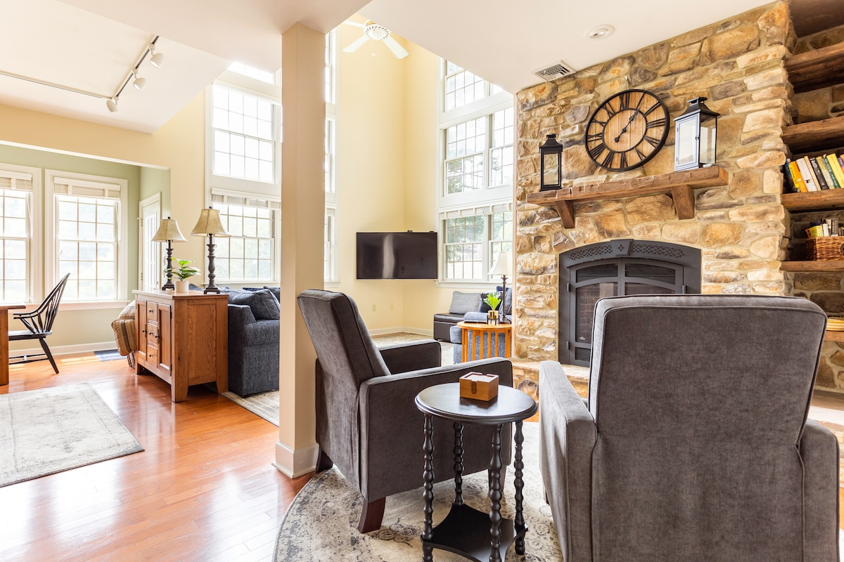 A charming cabin built circa 1780 situated right on Main Street, just steps from Pubs and Restaurants and easy walking distance to historic Mercersburg Academy. There is a separate sleeping area upstairs with a queen-size memory foam bed. The lower level features a foldout couch and air mattress for additional guests, as well as a 55" TV and a wet bar and bathroom. Visitors have universally enjoyed the cabin's cozy feel. While there is no yard available, the town is great for walking dogs.