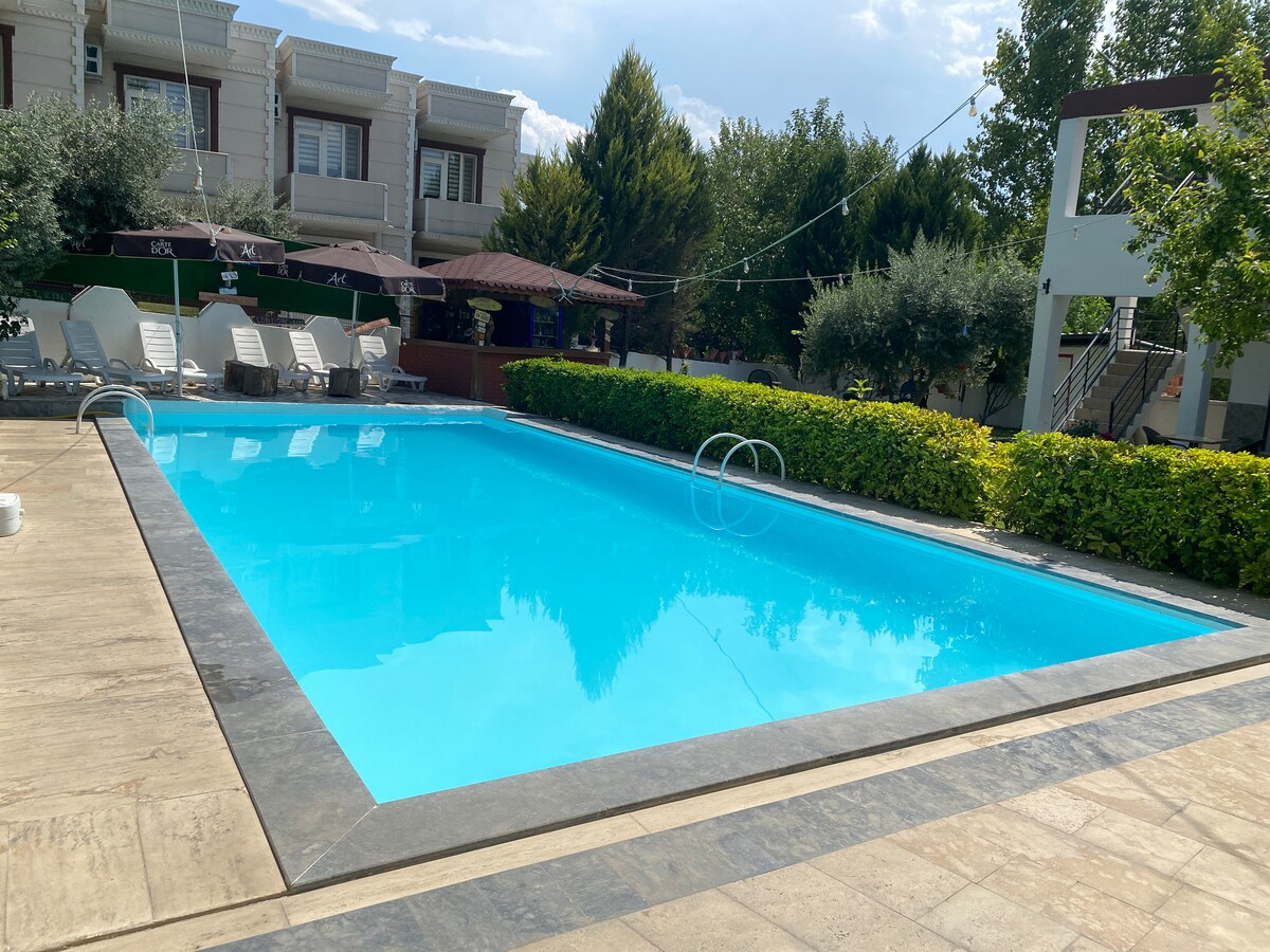You are invited to a peaceful area away from the noise of the city. With its modern architecture and carefully selected decoration, our villa is designed for you to experience comfort at the highest level. • Fully isolated detached garden, large swimming pool and elegant barbecue area. •3 bedrooms, air conditioning in every room and high-speed fiber internet. • Only 10 minutes from the city center. How about relieving the tiredness of the day by watching the sunset by the pool? Book now, don't miss out on this special experience!