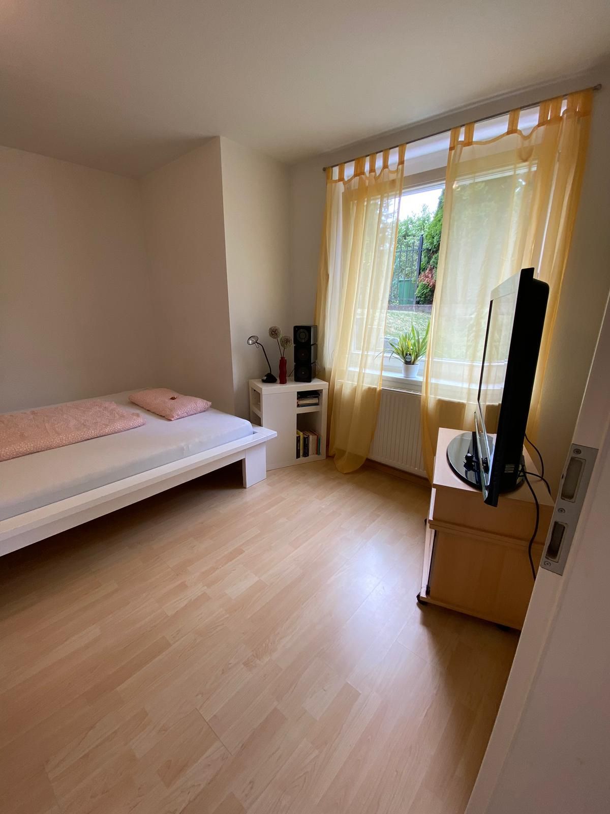 Apartment in a detached house. Private entrance, well-equipped kitchen, nice spacious bathroom, towels and linens provided, garden can also be used. One bedroom with double bed (160 × 200), wardrobe and armchair. Second small bedroom with up to two single beds (100 x 200) and workplace, also suitable as a children's room. A washing machine and dryer are available.