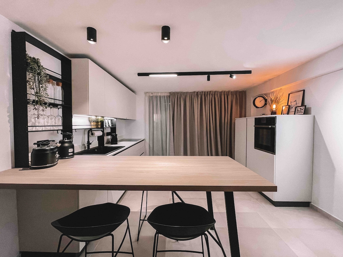 This sunny seafront apartment with easy mobility is located in the heart of the business and leisure district. Designed in the summer '19 by the host Architect in collaboration with a contemporary artist. The fusion of art & architecture in the apartment is felt throughout every object and detail. Intention: To redefine luxury by surrounding guests with collectors' items, green, beautiful colors art so the accommodation becomes an experience.