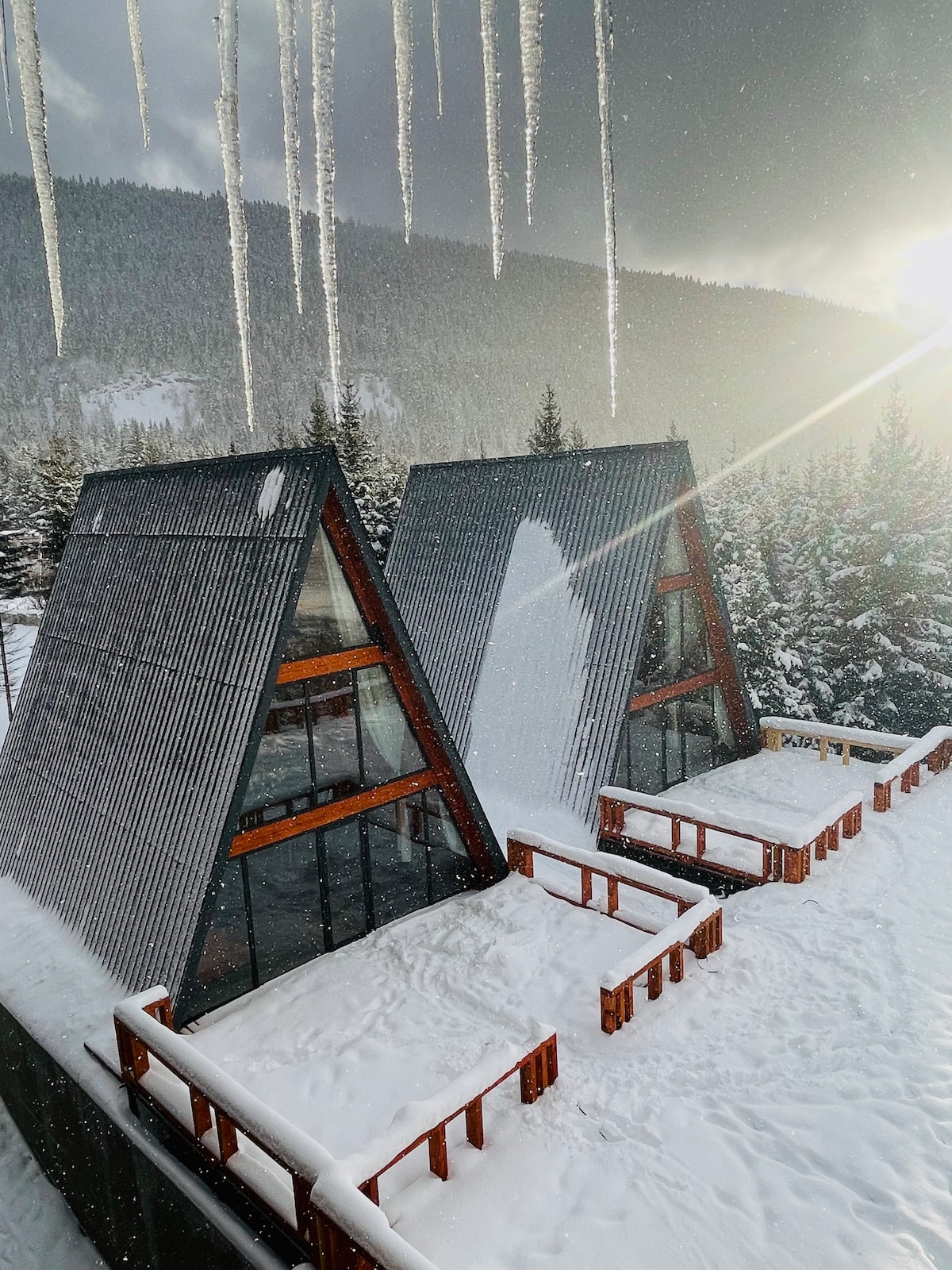 Wooden house with glass roof and Ushba view