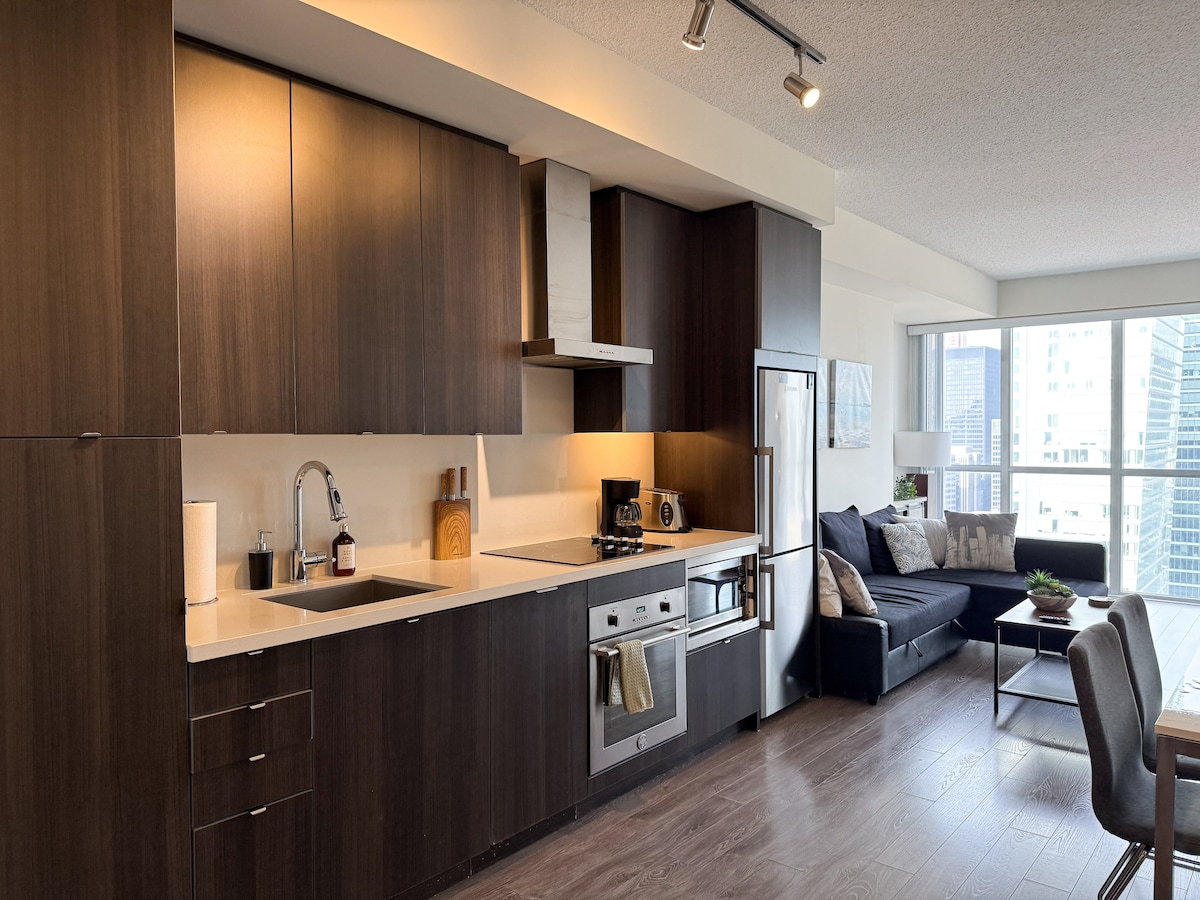 Stay in the heart of downtown Toronto in this modern one-bedroom condo just steps from the CN Tower, Rogers Centre, and the waterfront. The unit features a comfortable queen bed in the bedroom and a sofa bed in the living room, perfect for couples or small groups. Enjoy skyline views through floor-to-ceiling windows or relax on the private balcony. The condo includes a full kitchen, smart TV, high-speed Wi-Fi, and in-suite washer and dryer. Guests also have access to a gym and outdoor pool .