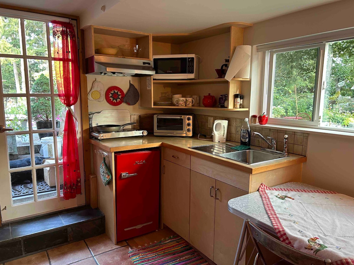 Discover tranquility in our heritage farm retreat, nestled on acreage with 2 dogs , 2 cats , chickens/ roosters & a pond with fish to sit by under the apple tree. There’s a big colorful garden, art fence by our own fir forest. Located close to sunset beaches and Gibsons for supplies. Note: Suite is cozy, with 6'8" ceilings and 6' max shower & kitchenette. Enjoy meals by pond or patio, complimentary farm-fresh eggs, and breakfast supplies. Book your furry & feathered friends stay today 💛